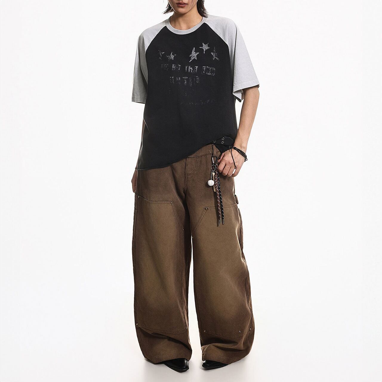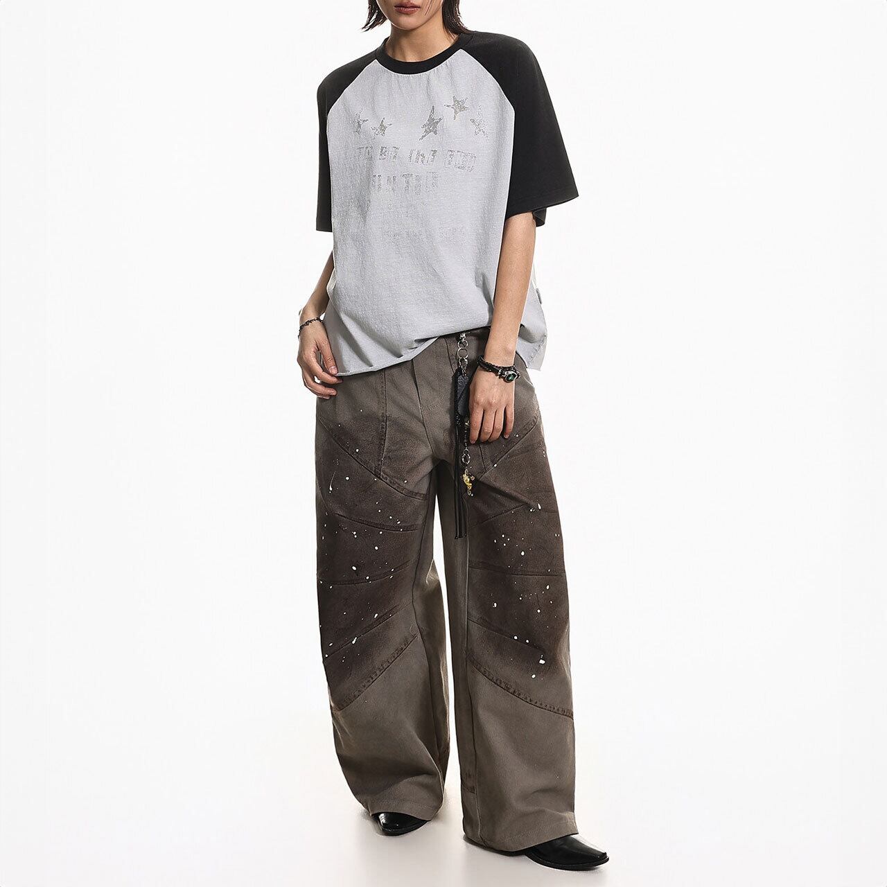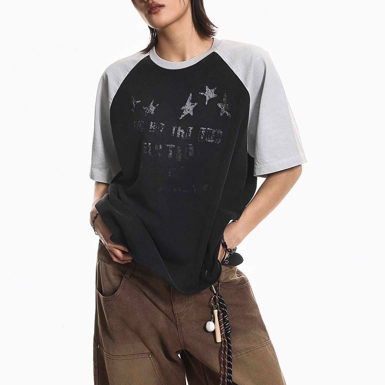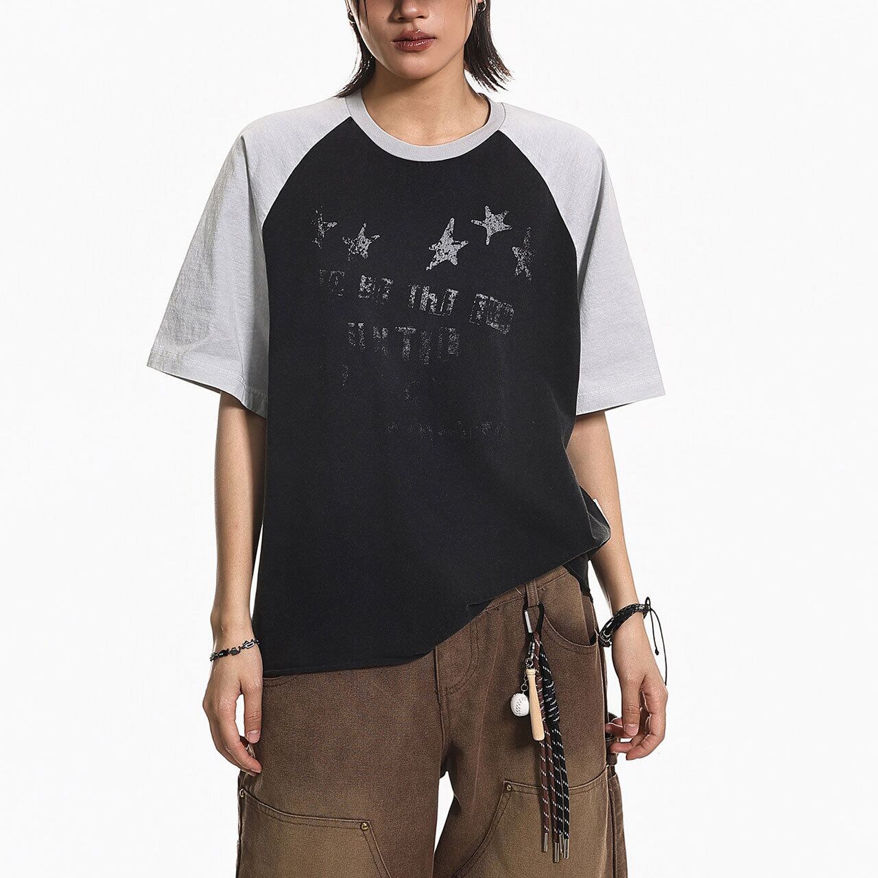 バイカラーの切り替えが目を引くラグランスリーブに、星のモチーフを散りばめたキャッチーな1枚。