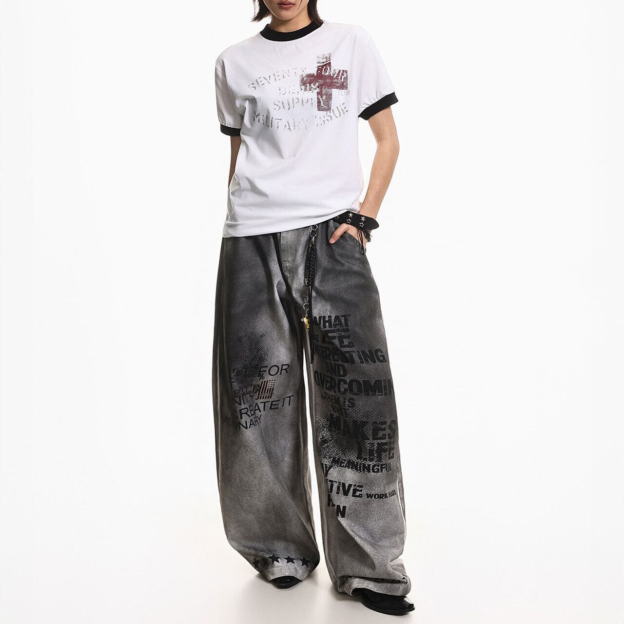 ミリタリーのエッセンスを感じさせる独特のレタリングデザインが、ラフなスタイルにこなれ感を演出。