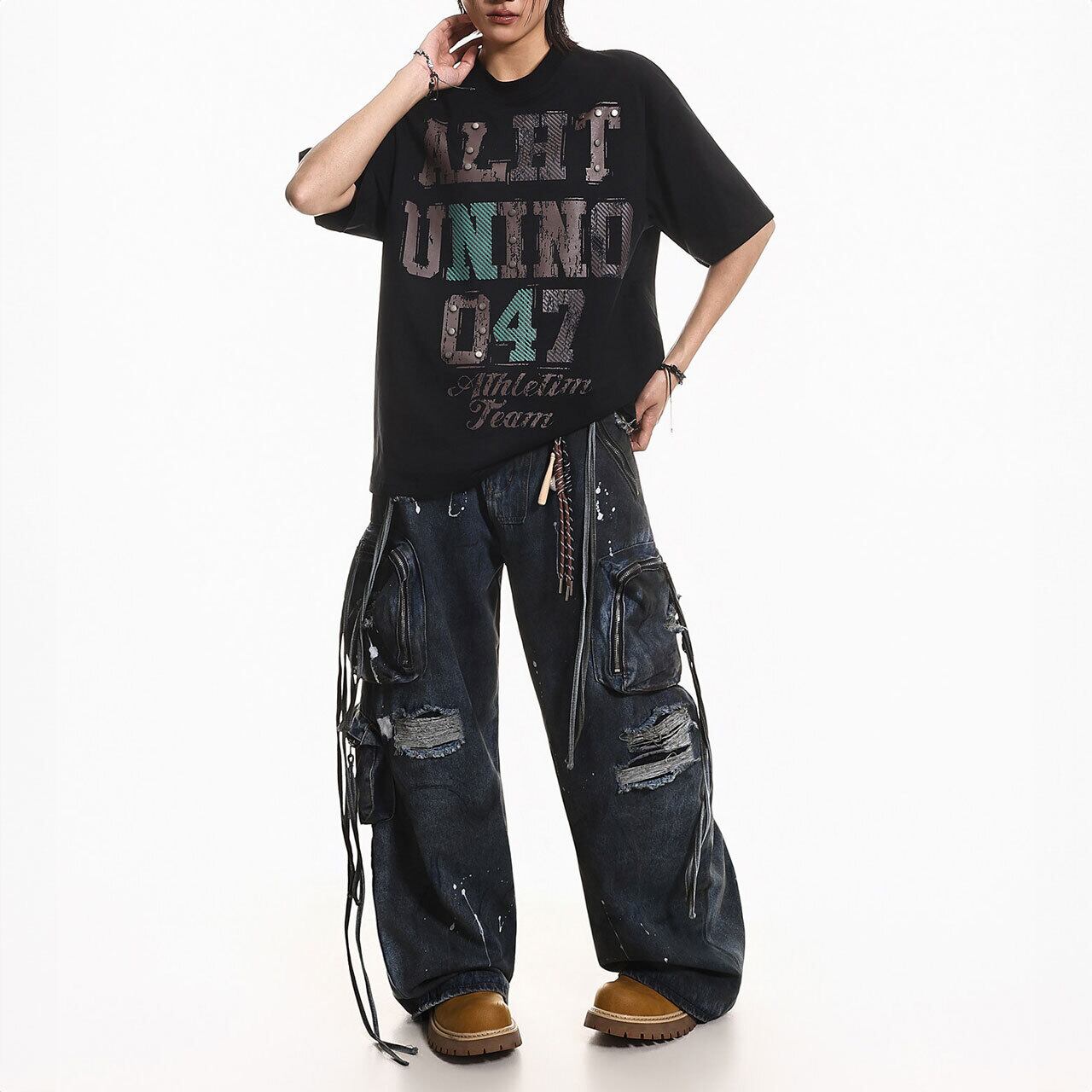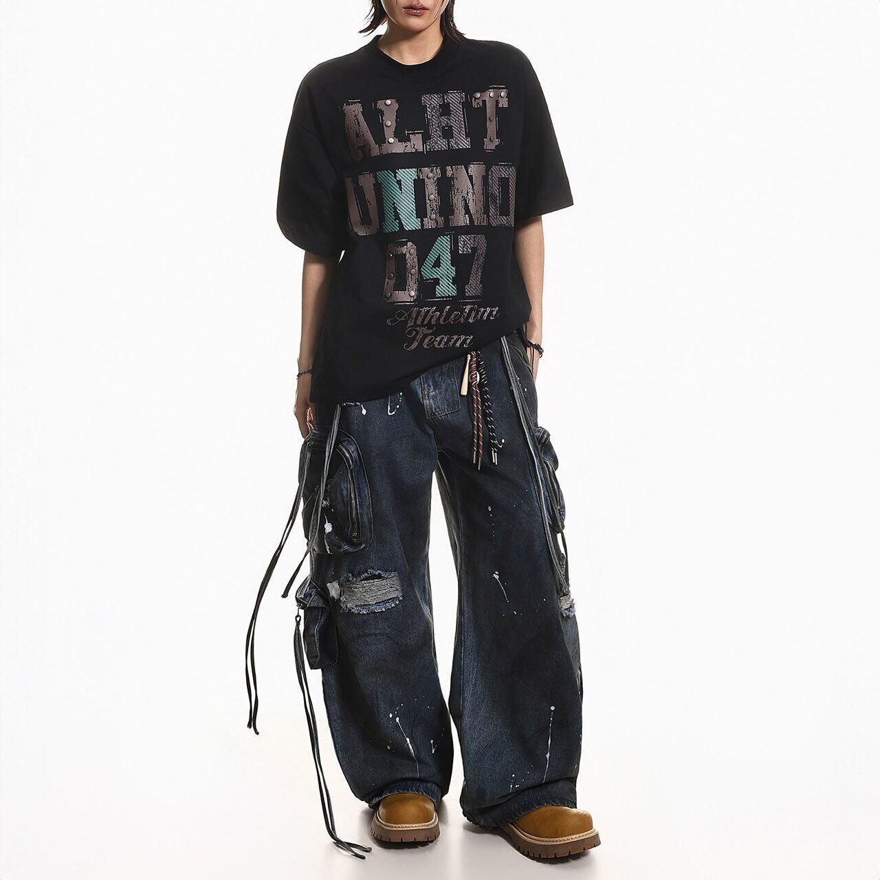 無骨なグラフィックデザインに、スタッズ風のアクセントを効かせた存在感のある1着。