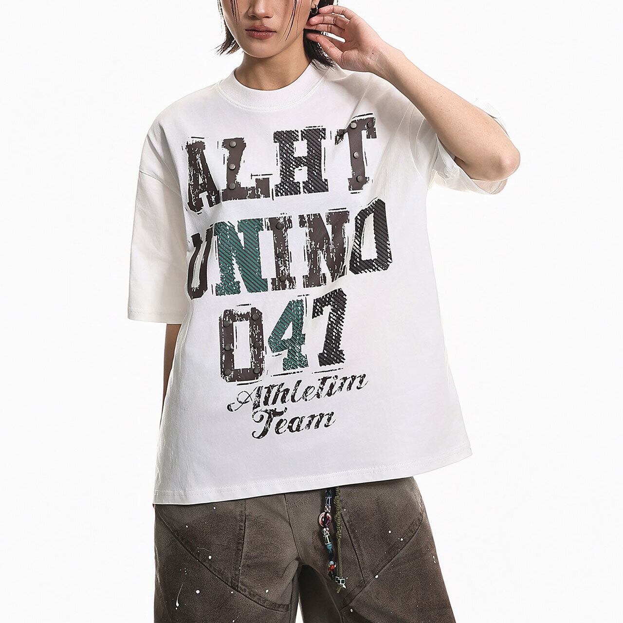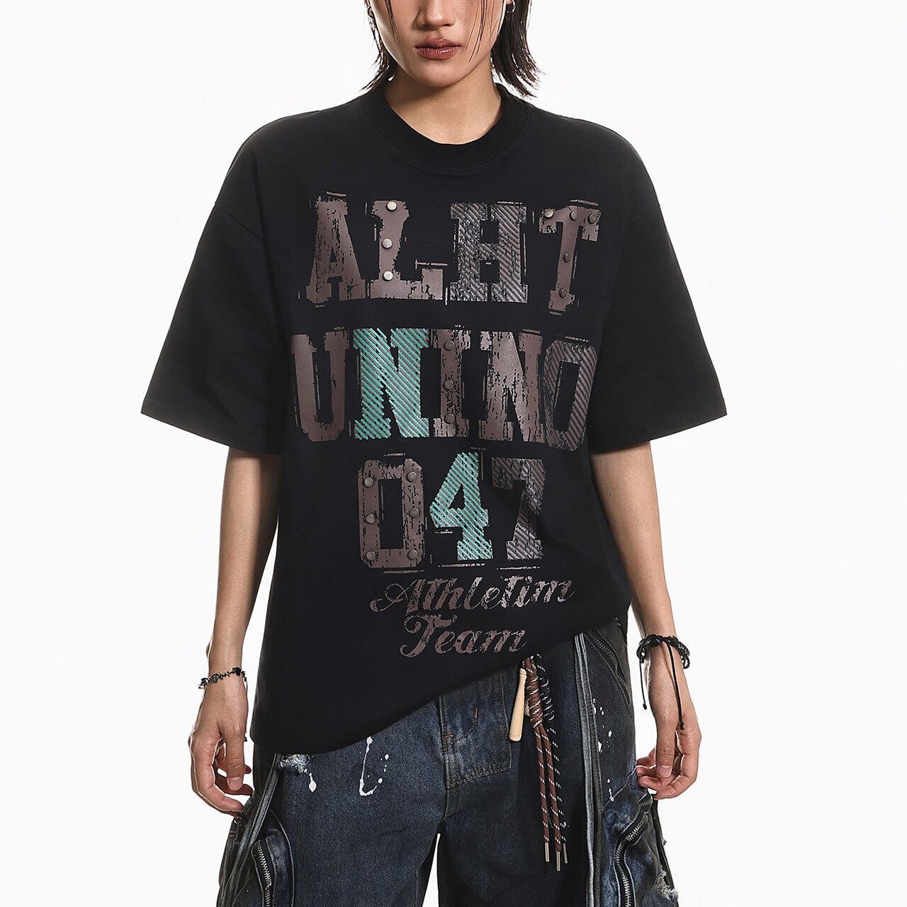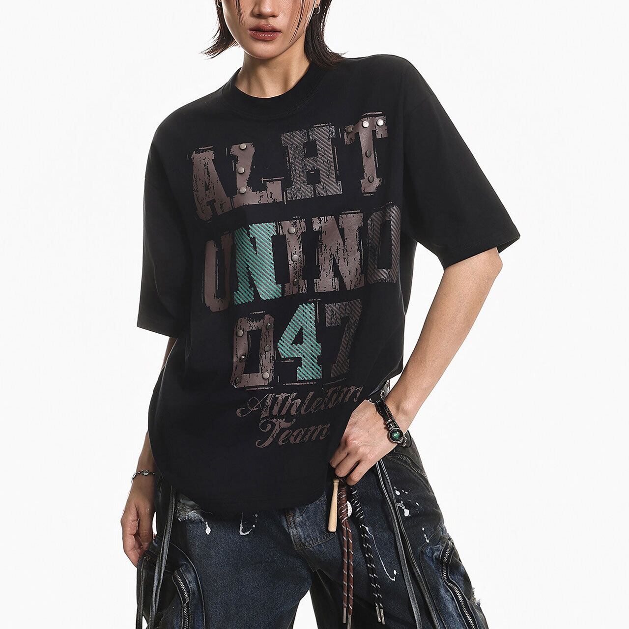 スタッズアクセントグラフィックTシャツ 2col R01975