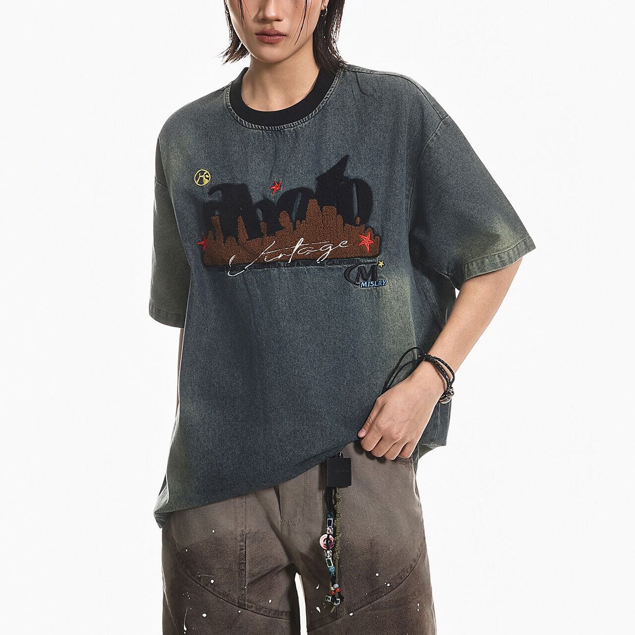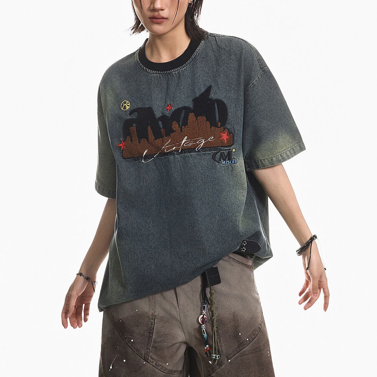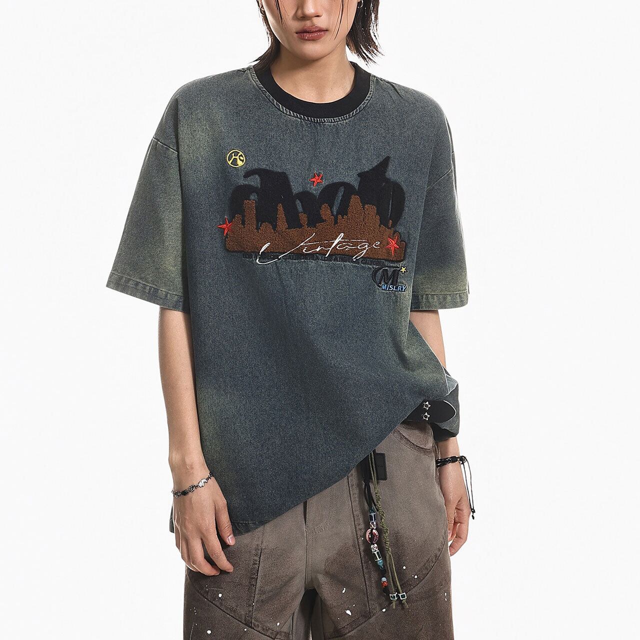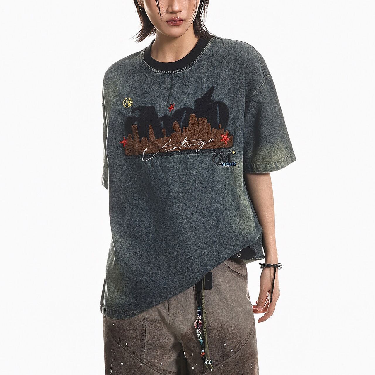 ヴィンテージ感漂うケミカルウォッシュ風のボディに、異素材を組み合わせた立体的なフロントデザインが目を引く1枚。