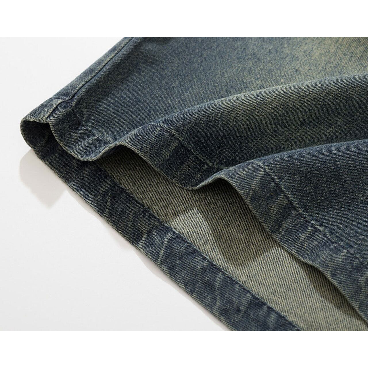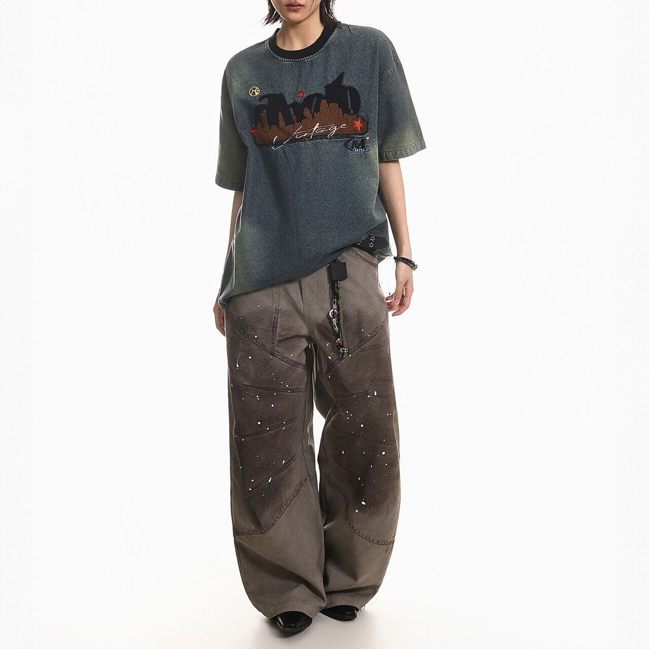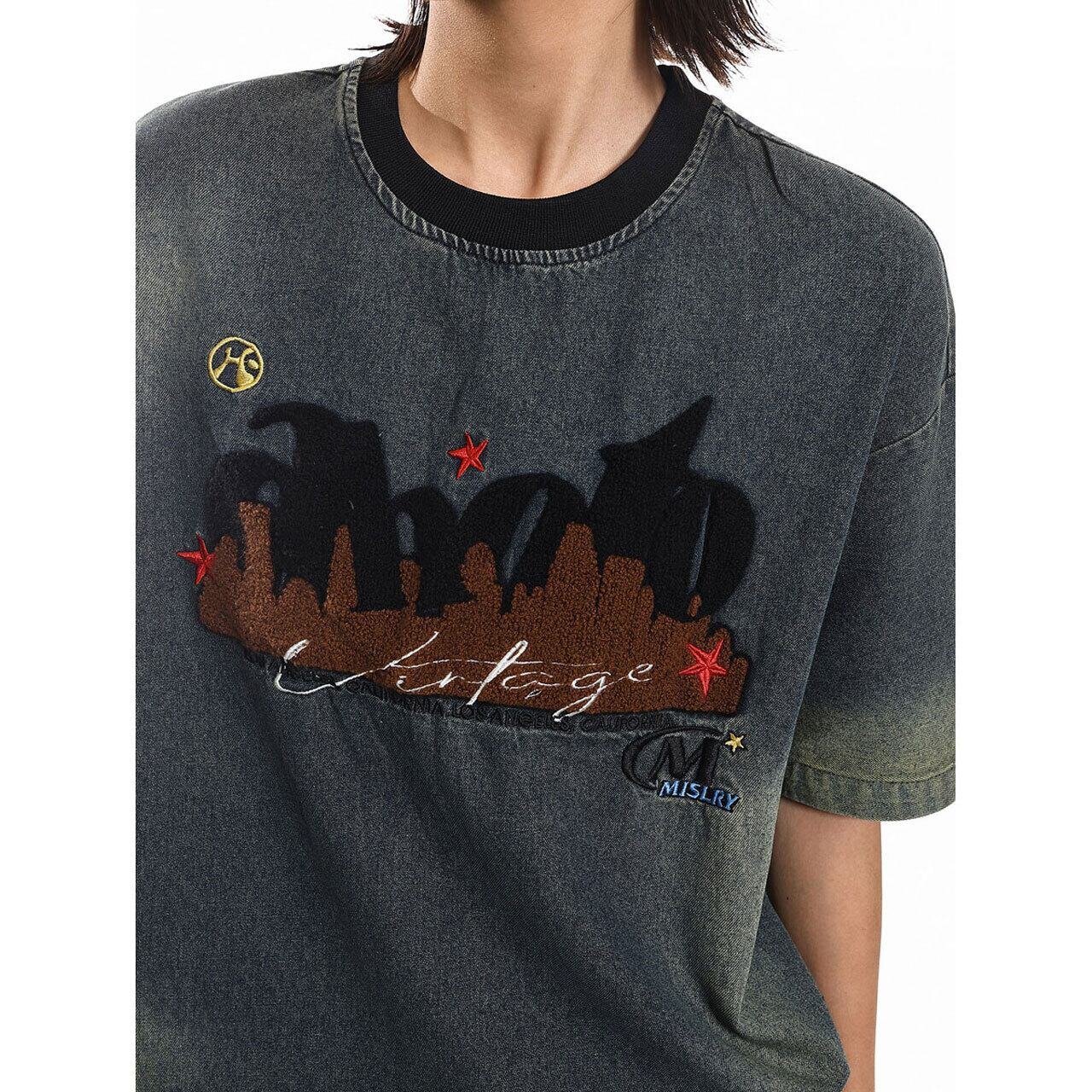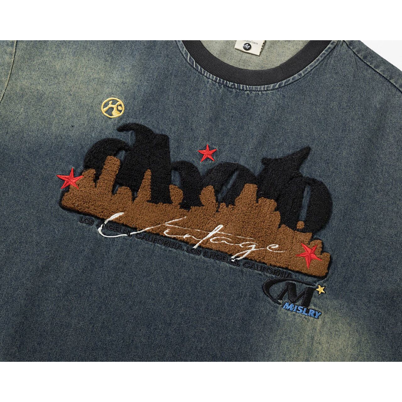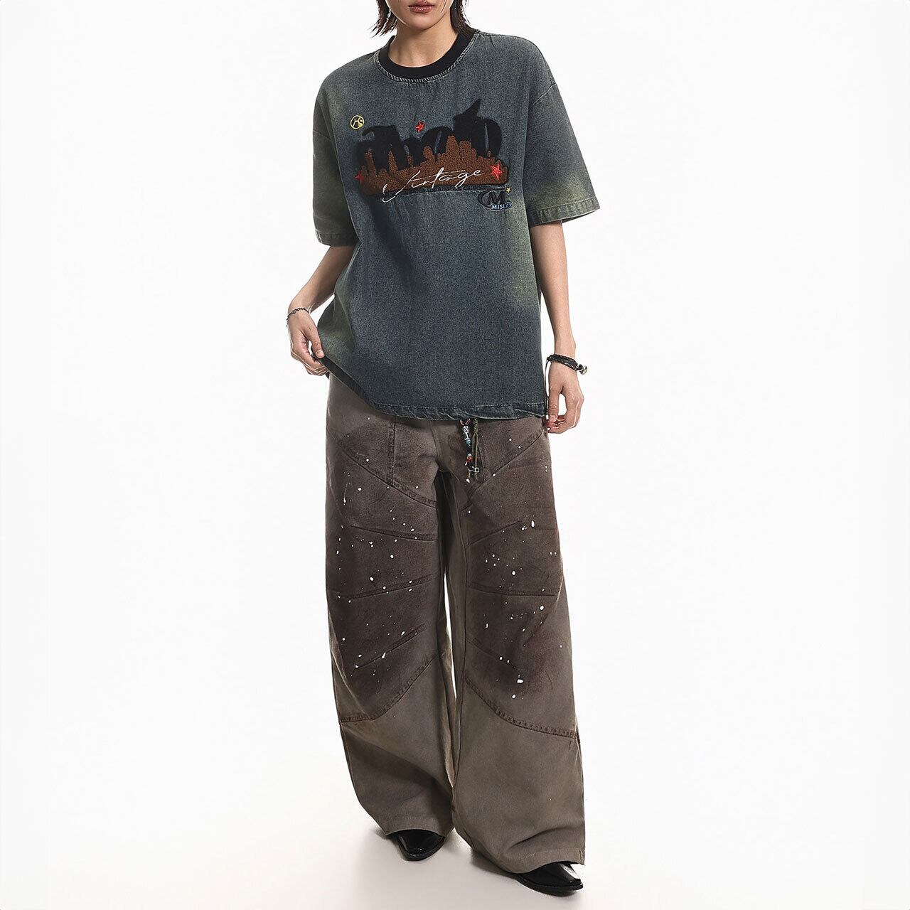 ヴィンテージ感漂うケミカルウォッシュ風のボディに、異素材を組み合わせた立体的なフロントデザインが目を引く1枚。