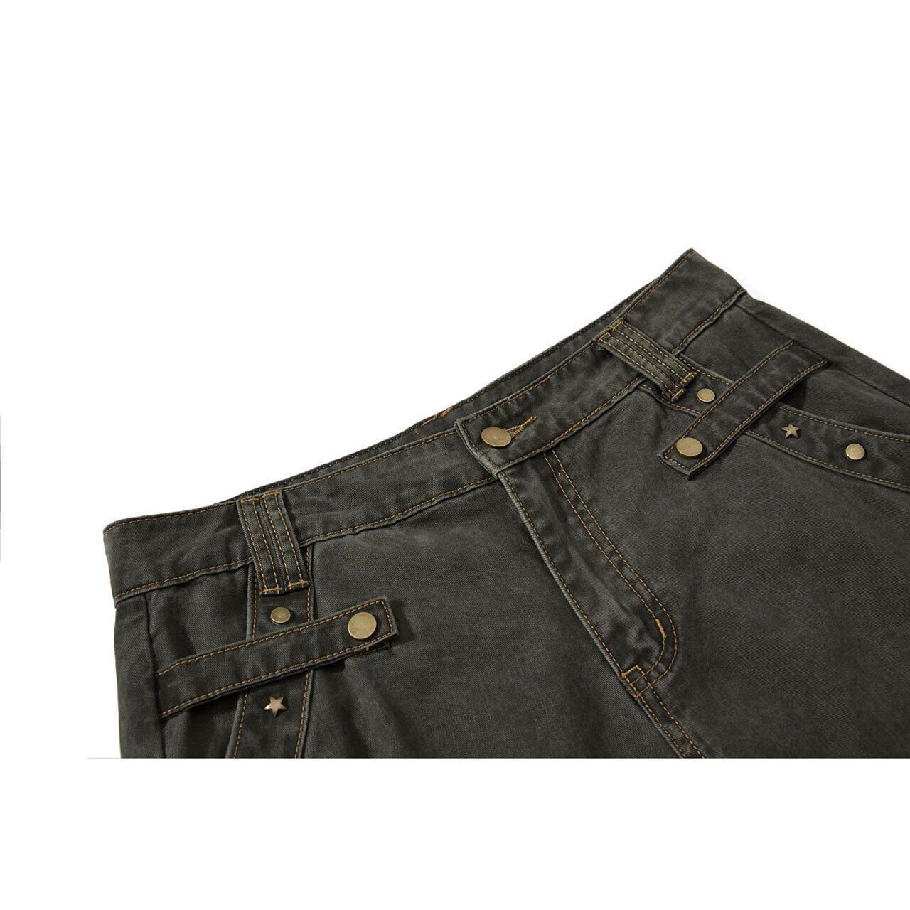幾重にも重なるサイドポケットや、ヴィンテージライクな表情を引き立てる独特の切り替え、星型のメタルパーツなど、遊び心溢れるディテールが随所に光ります。