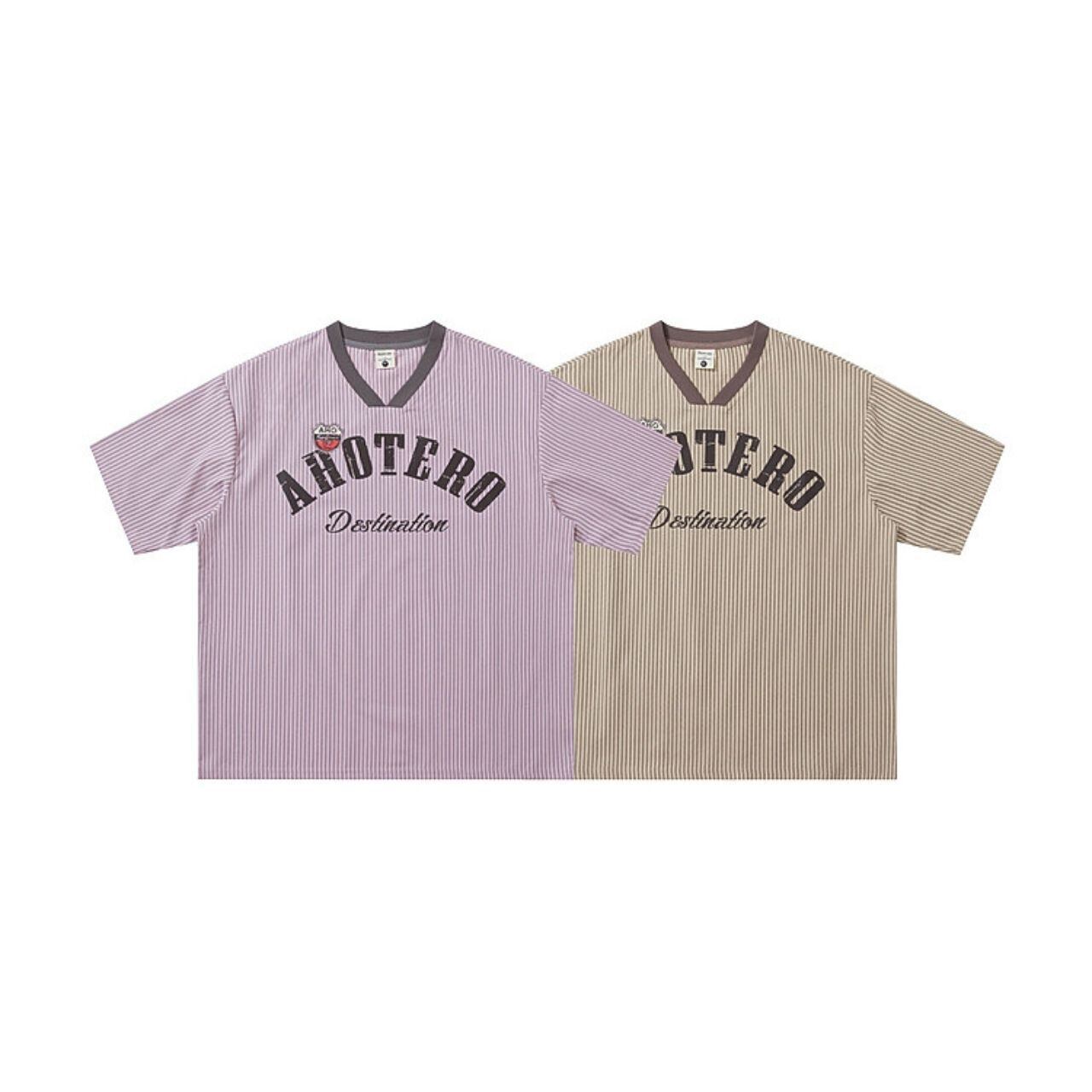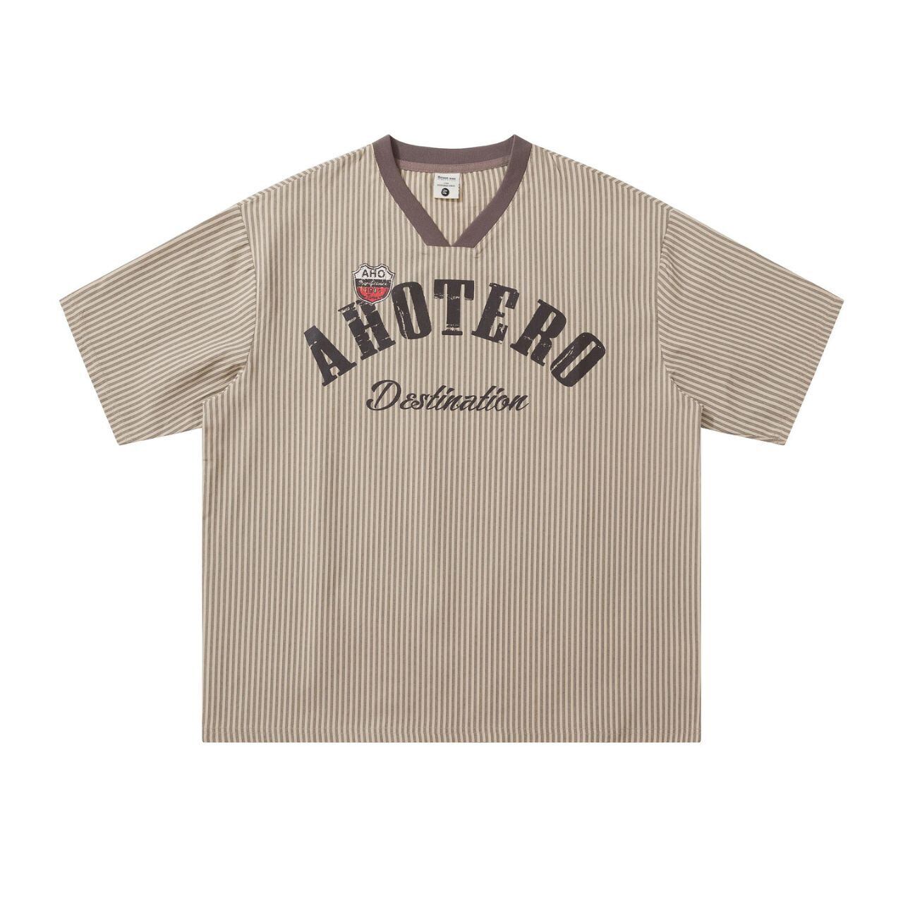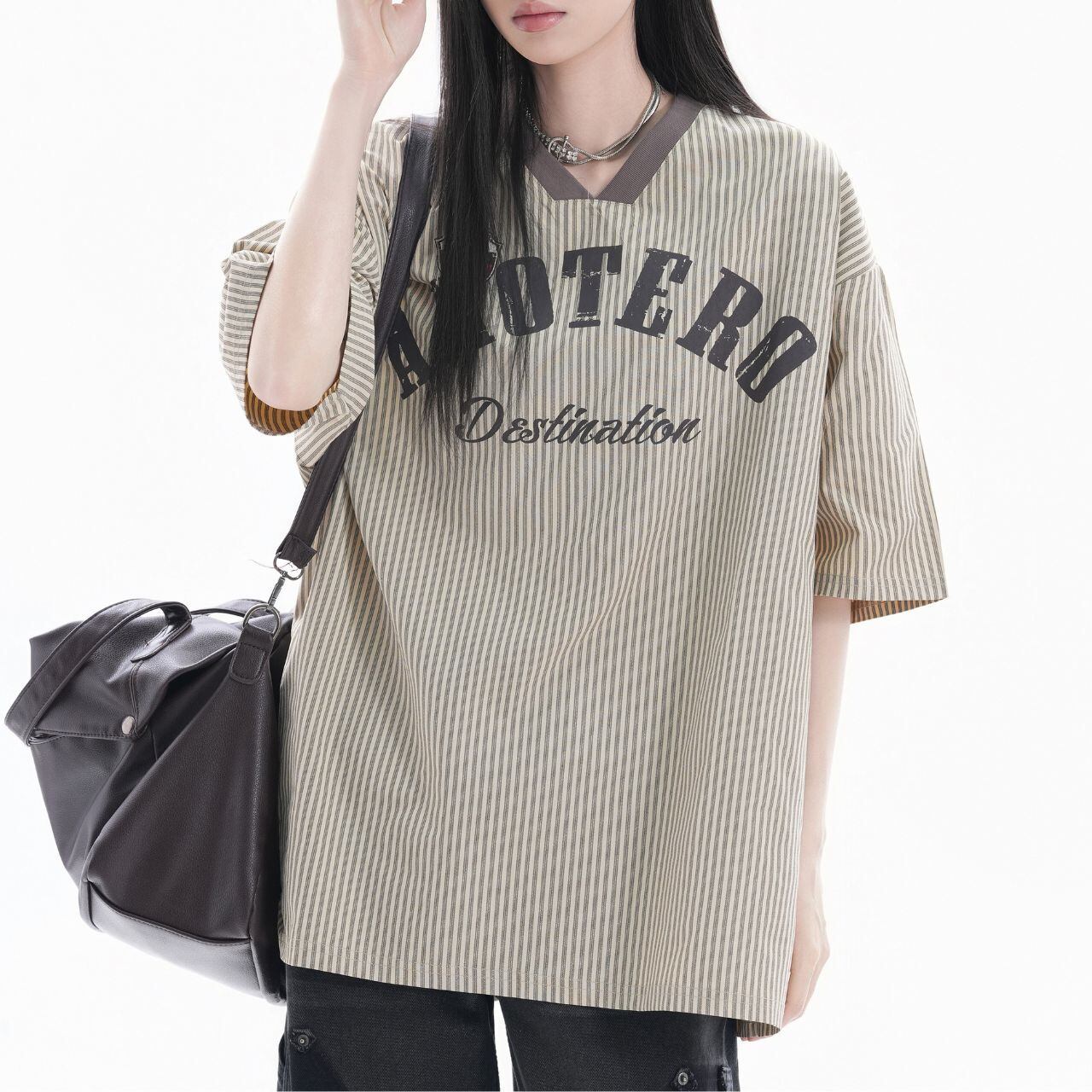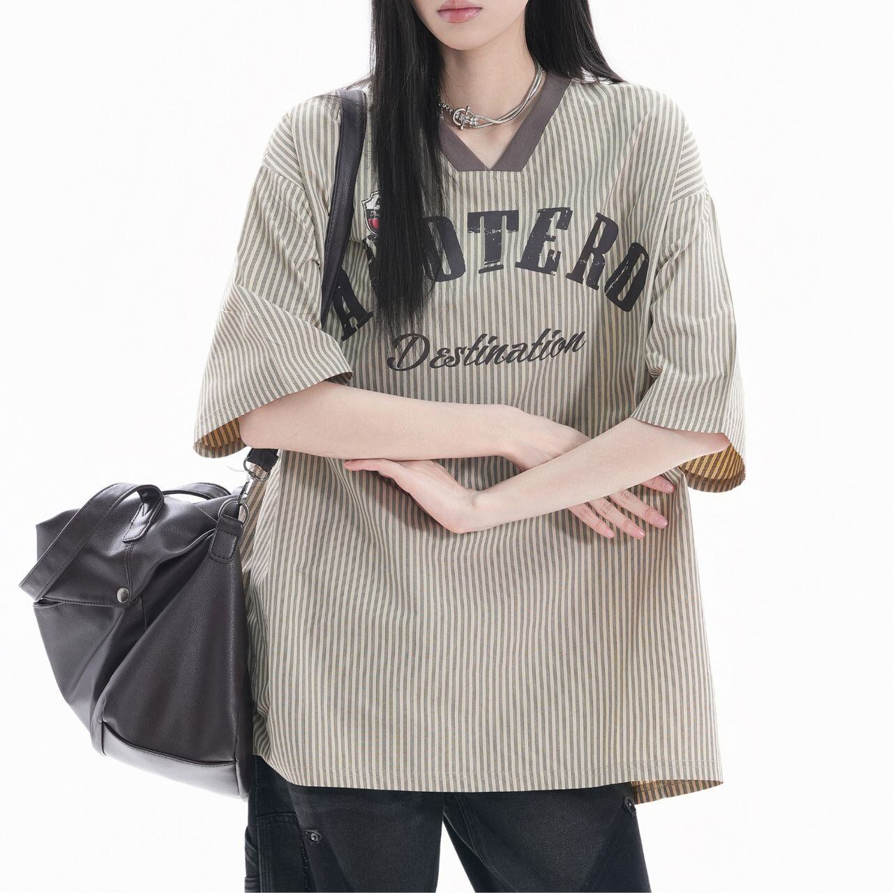 カレッジロゴストライプVネックTシャツ 2col R01981