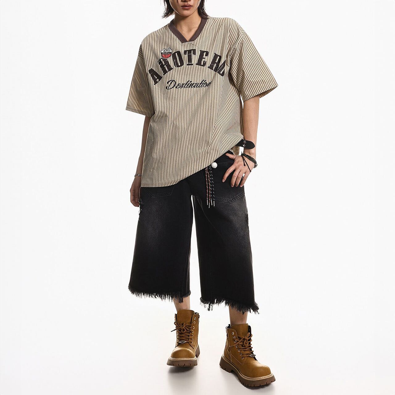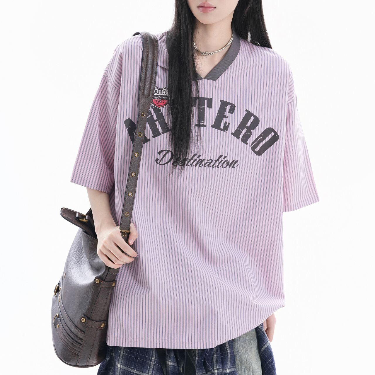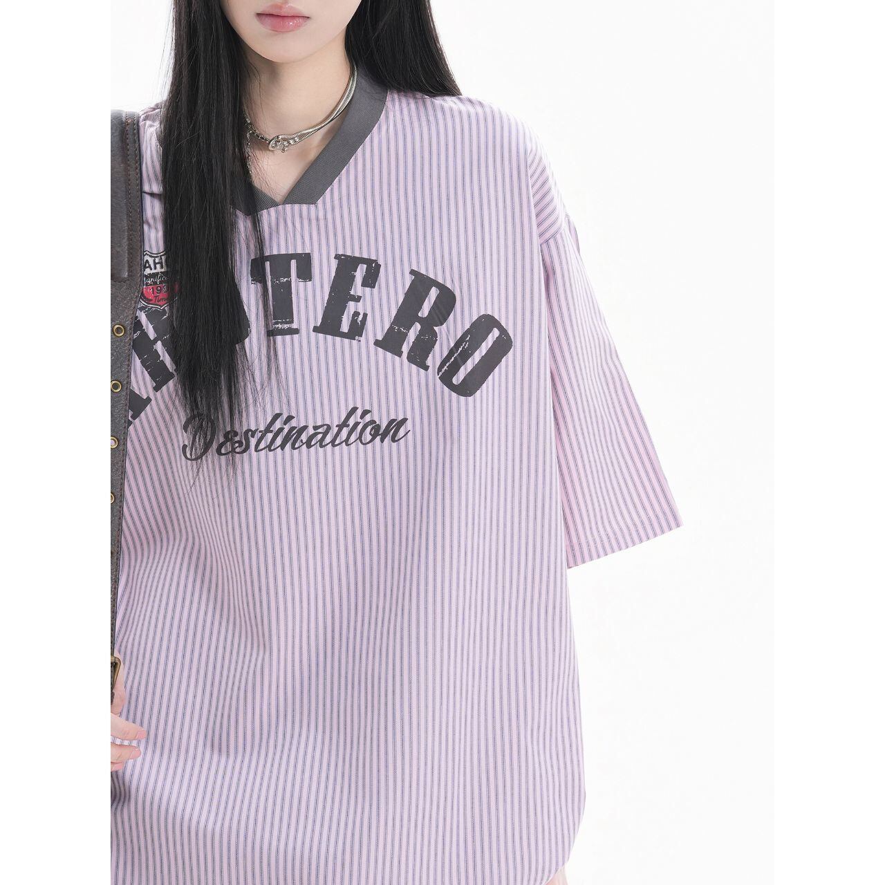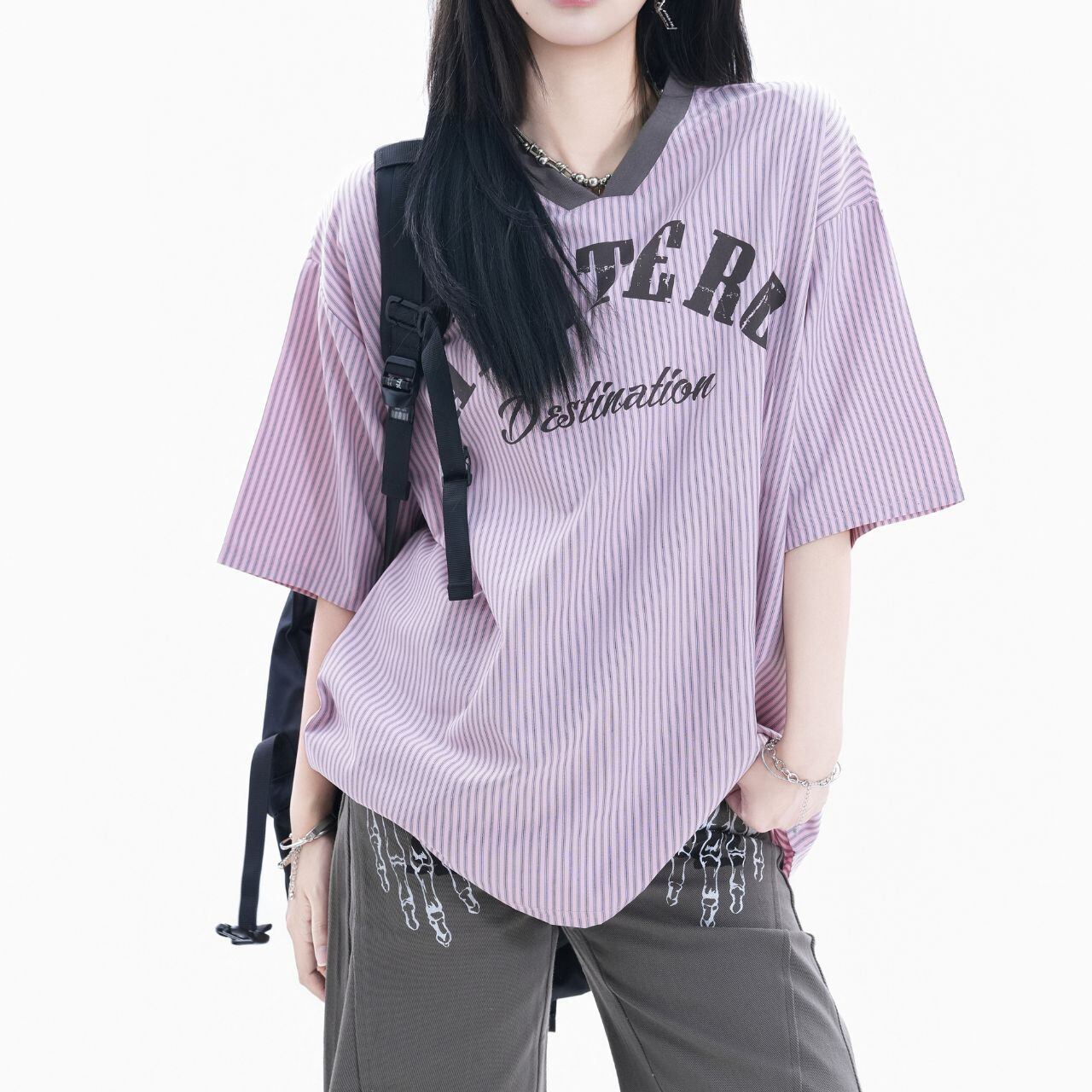 カレッジロゴストライプVネックTシャツ 2col R01981