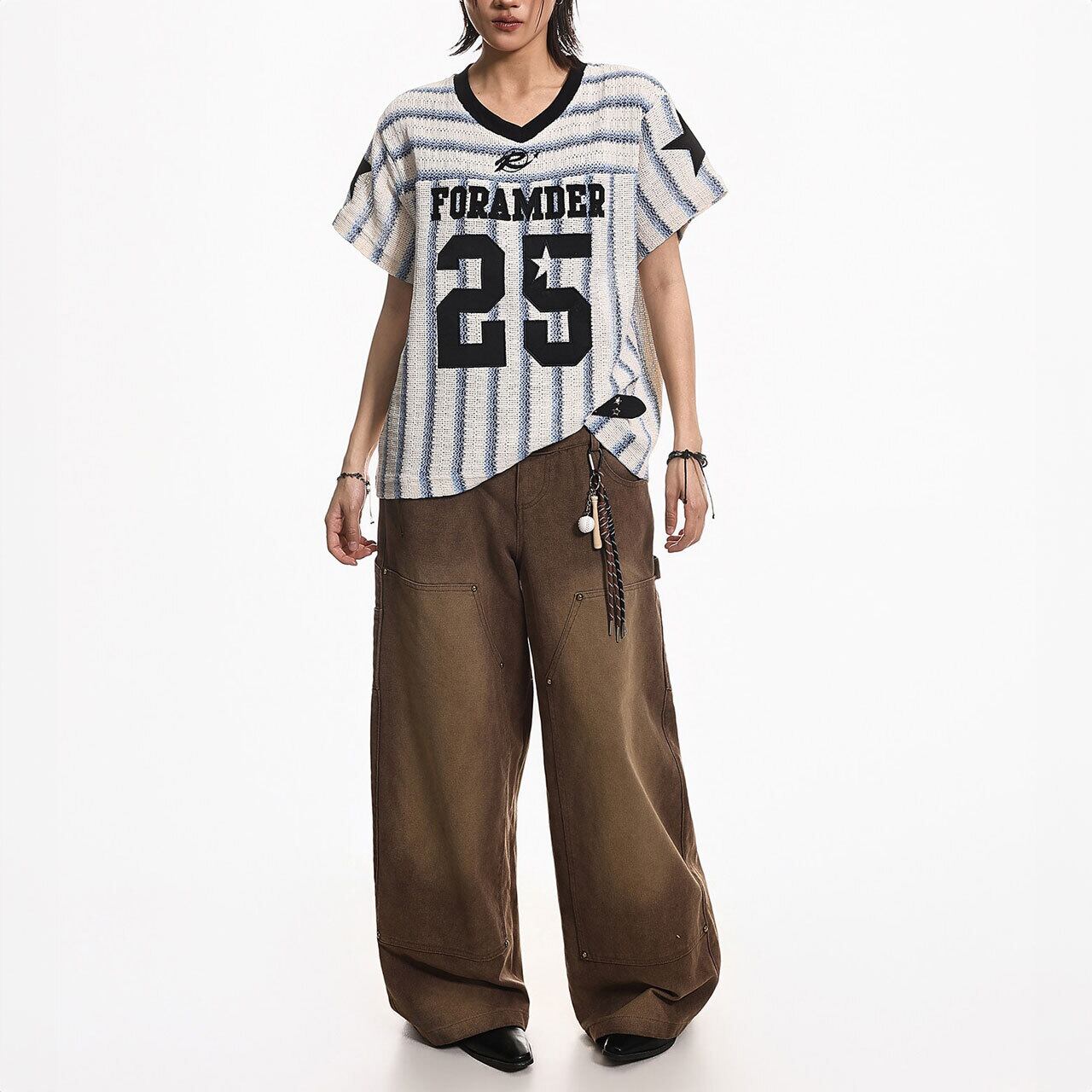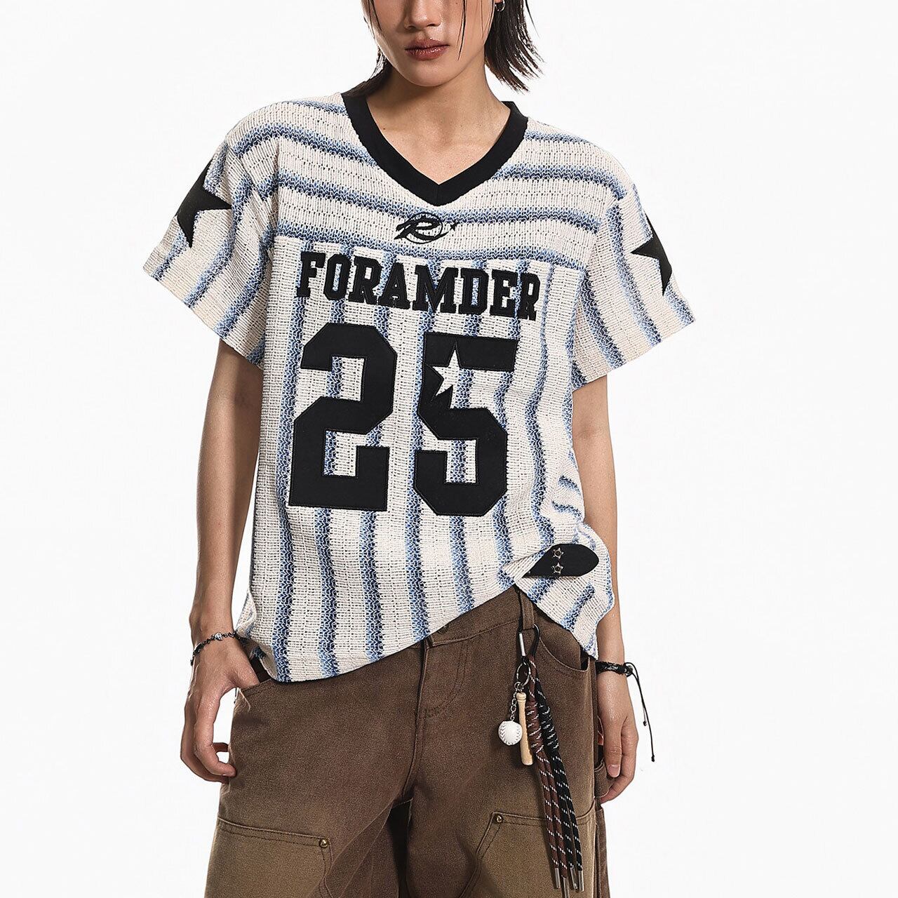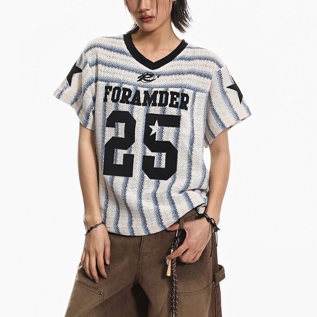 フロントに配された大胆なナンバリングと、両肩のスターモチーフがアメリカンレトロなストリート感を演出します。