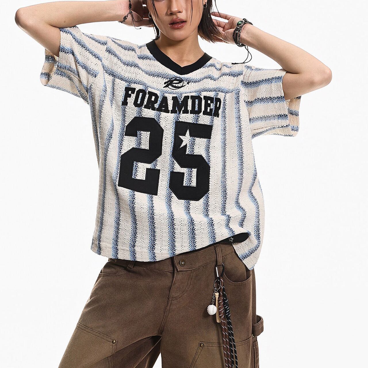 ナンバリングストライプメッシュVネックトップス 1col R01992
