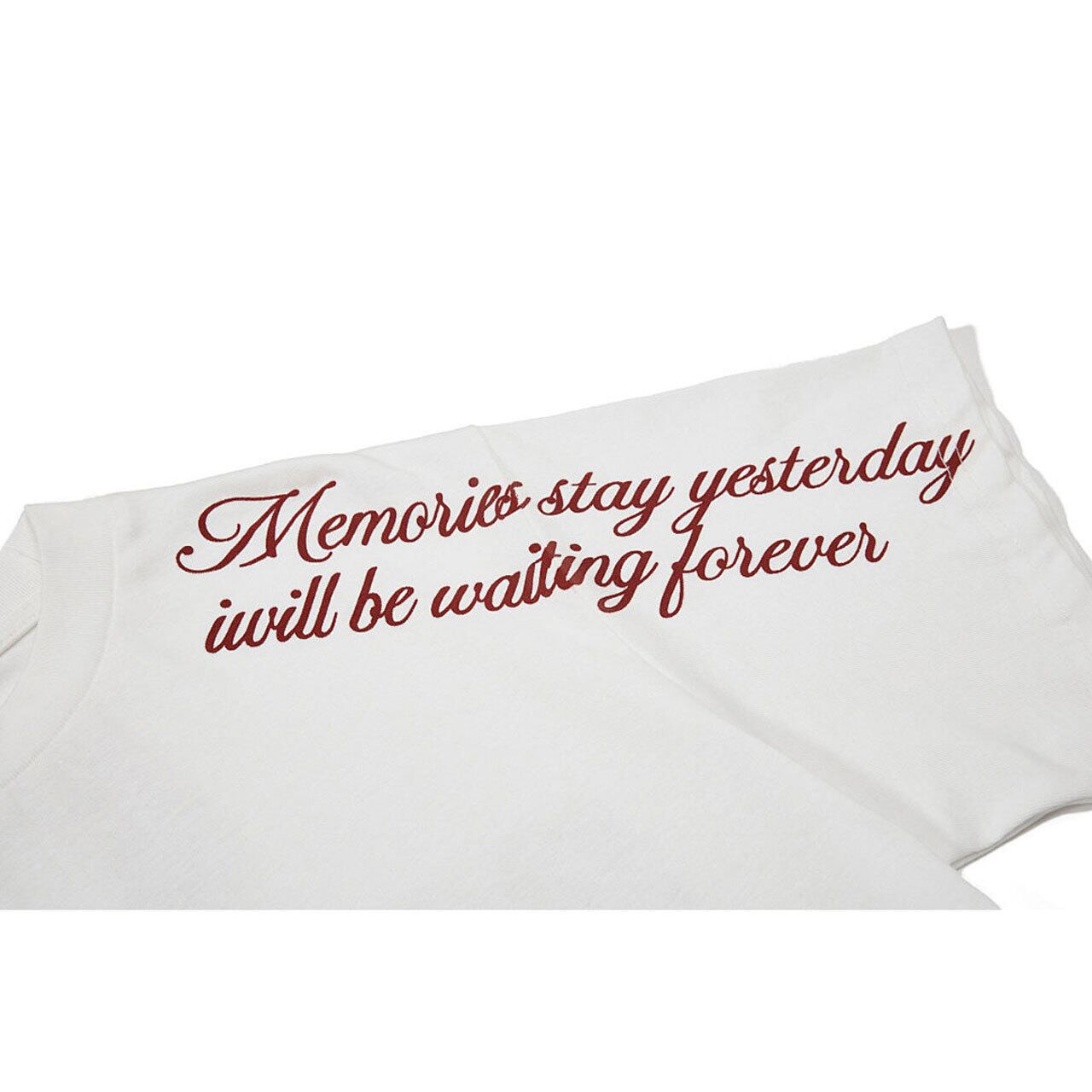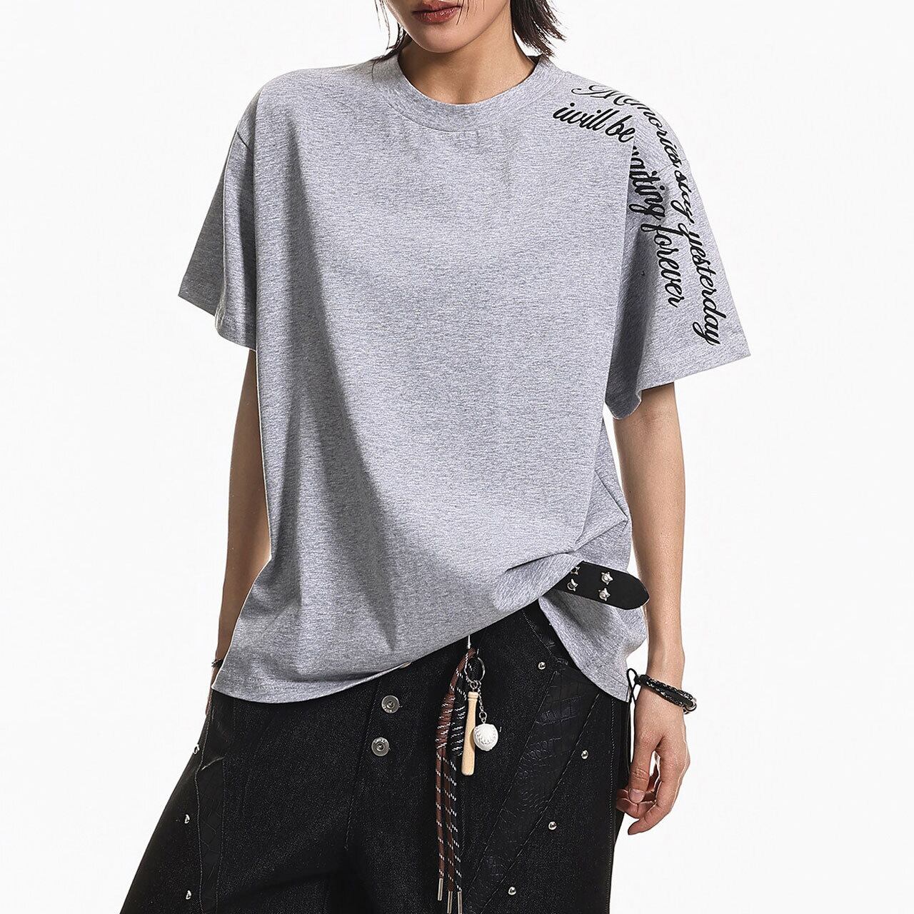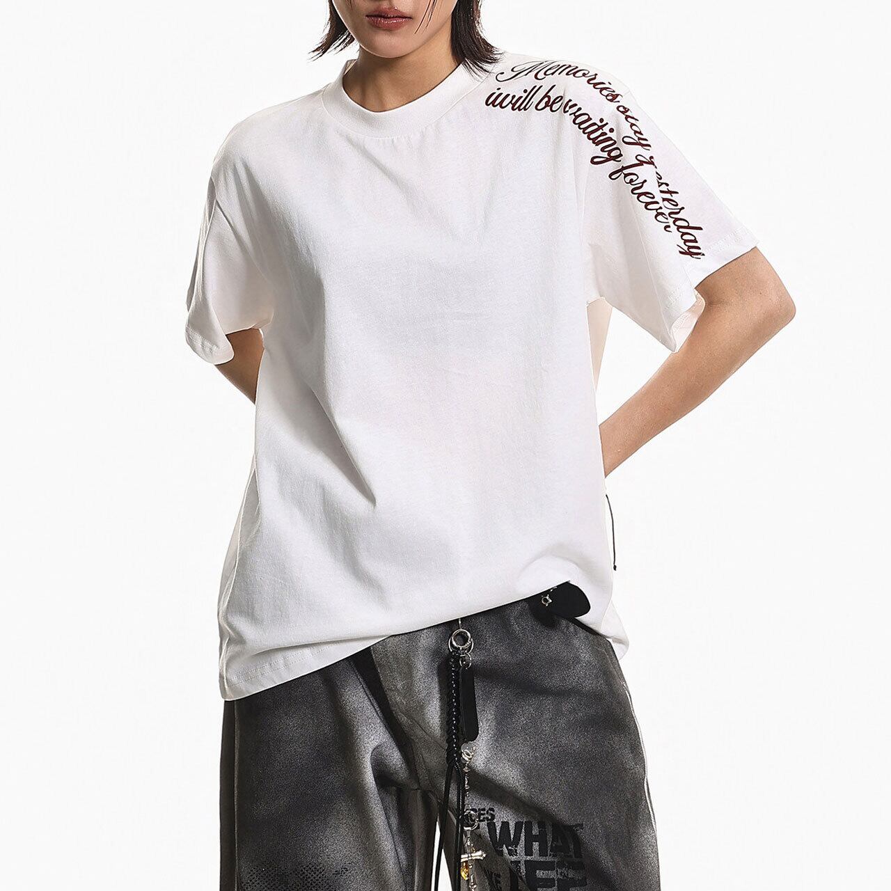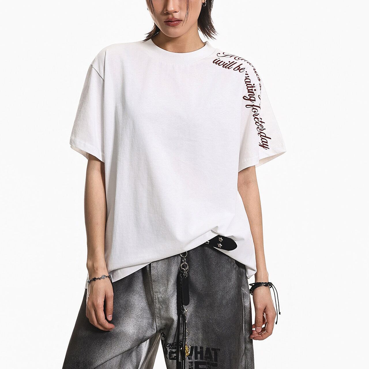 肩から袖にかけて流れるようなスクリプトデザインが、フロントスタイルにもさりげないアクセントをプラスします。