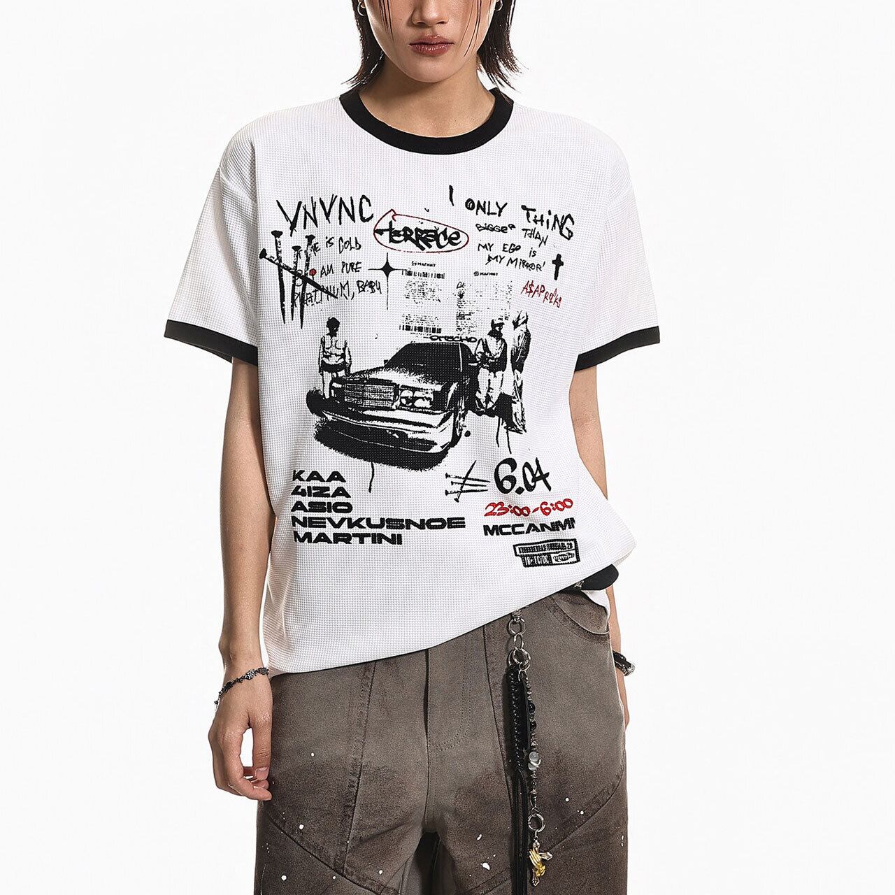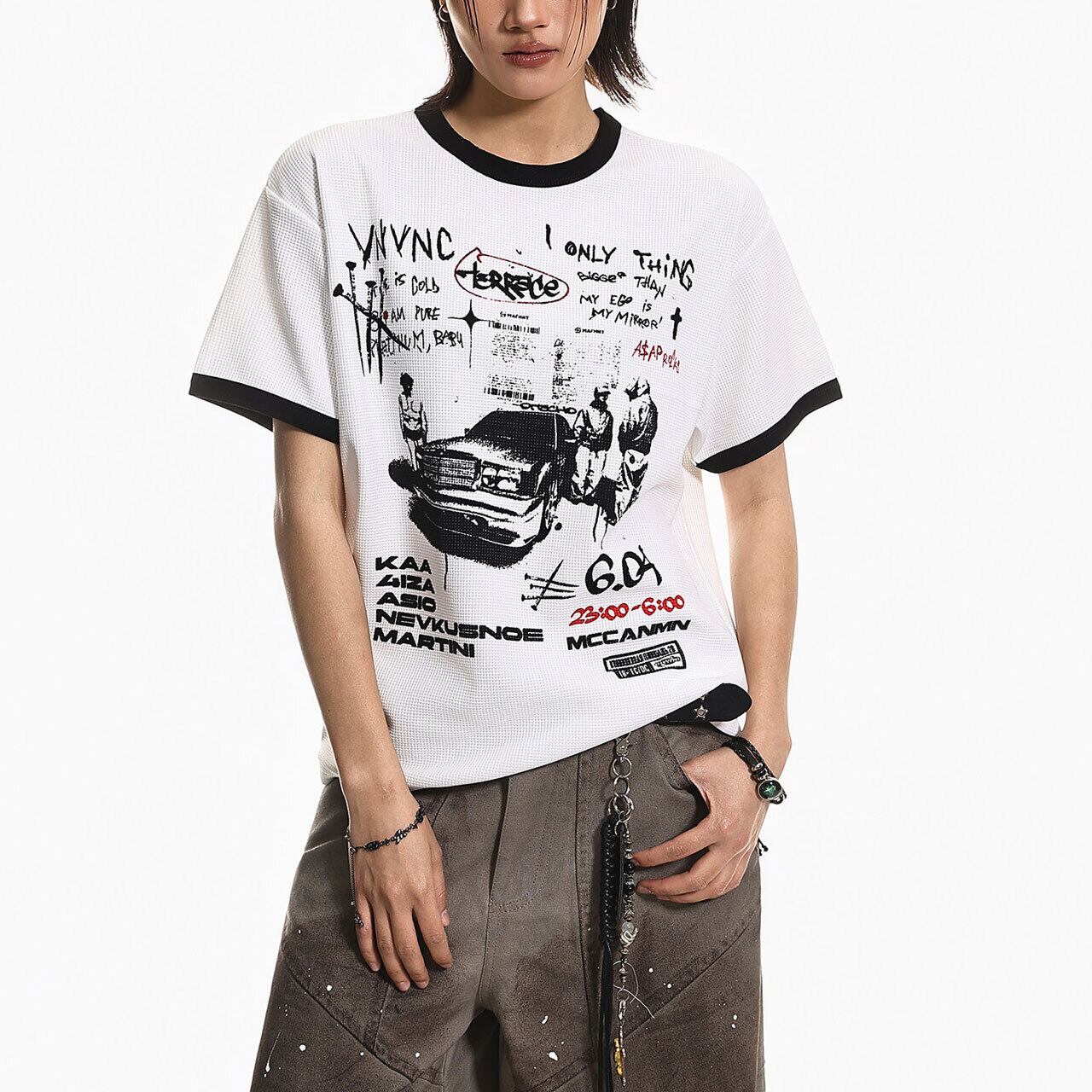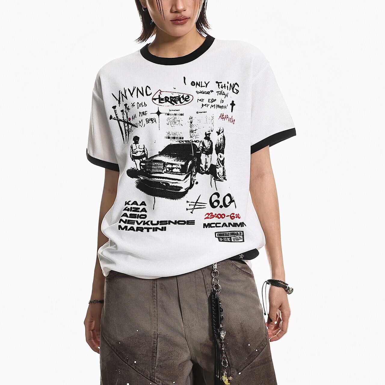 ストリートの熱気を感じさせるグラフィックを大胆に配置した、存在感抜群のリンガーTシャツ。