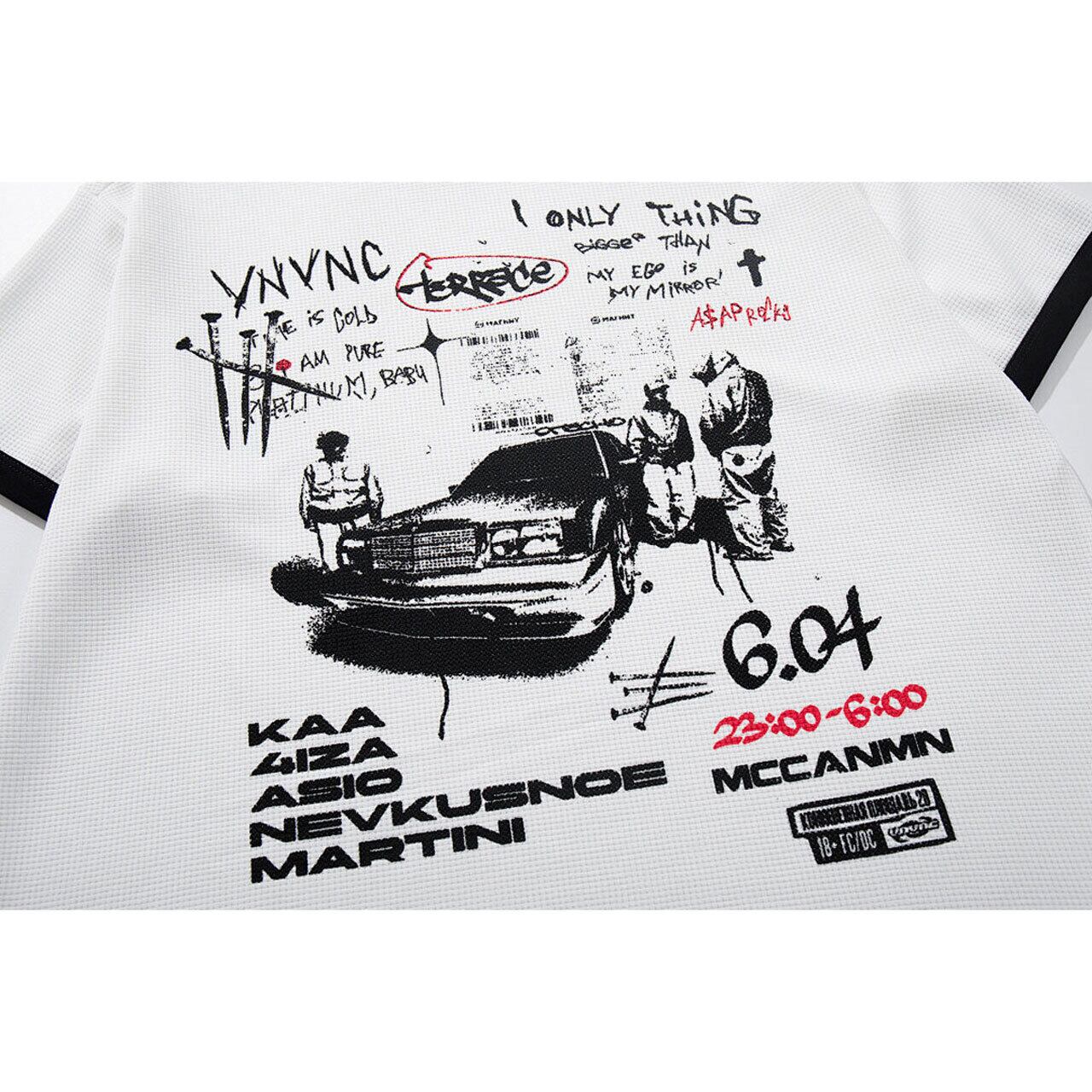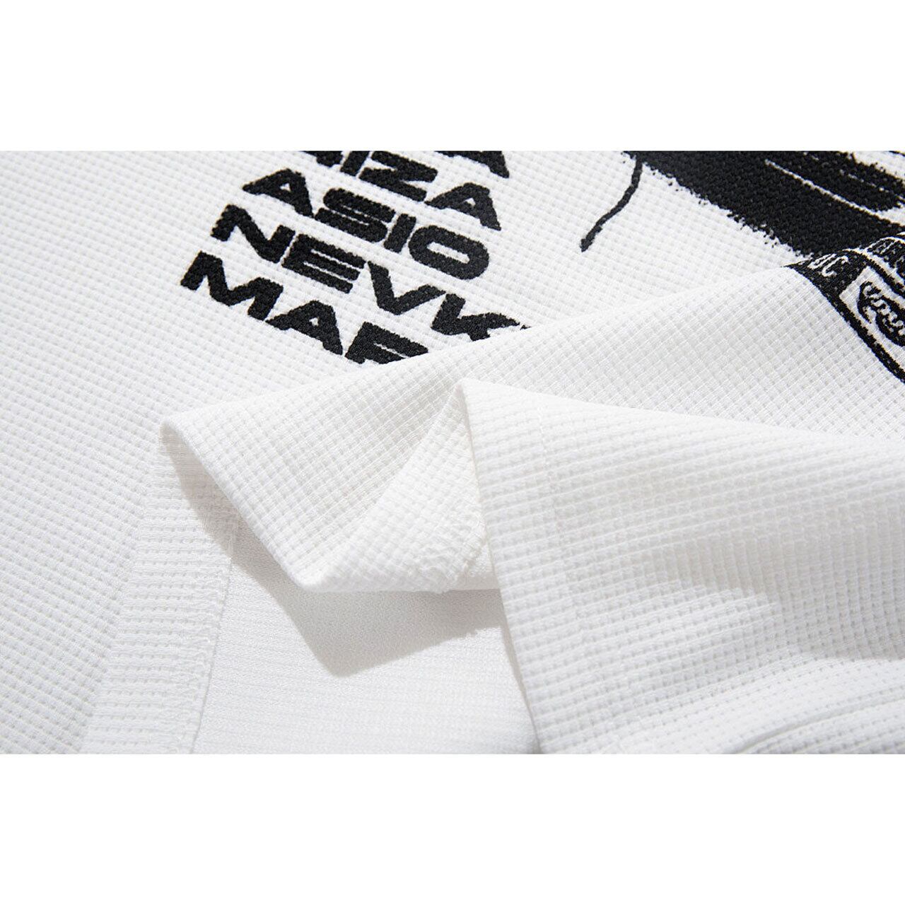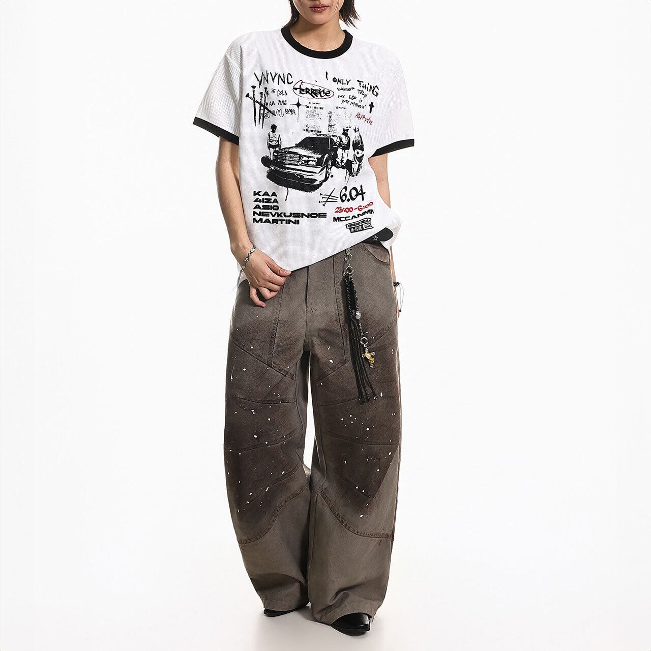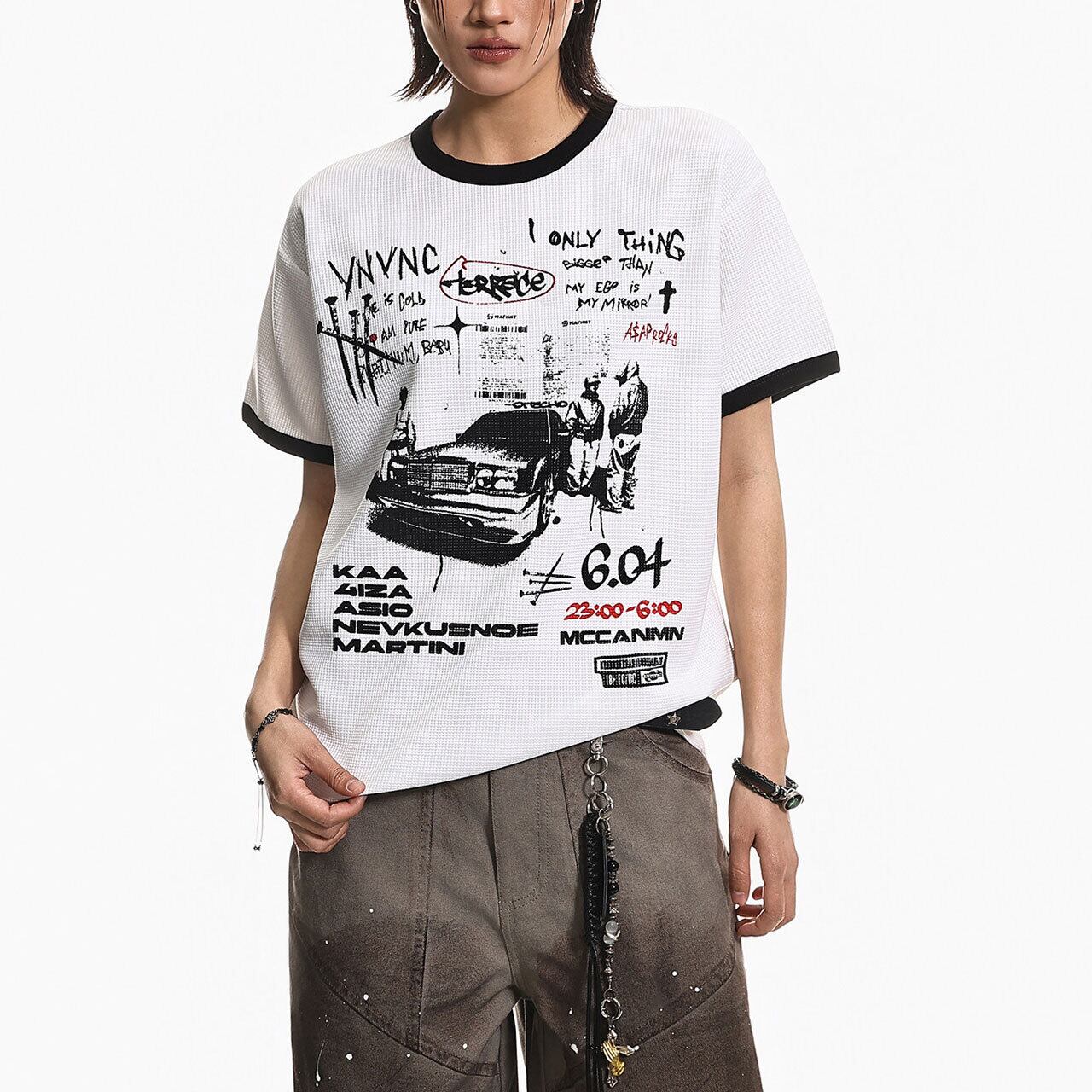 ストリートの熱気を感じさせるグラフィックを大胆に配置した、存在感抜群のリンガーTシャツ。