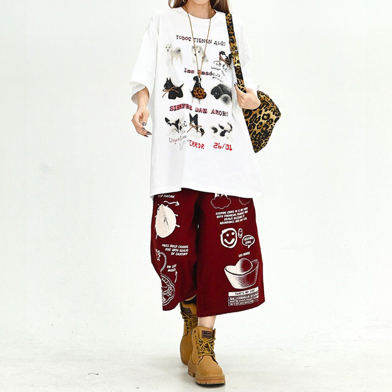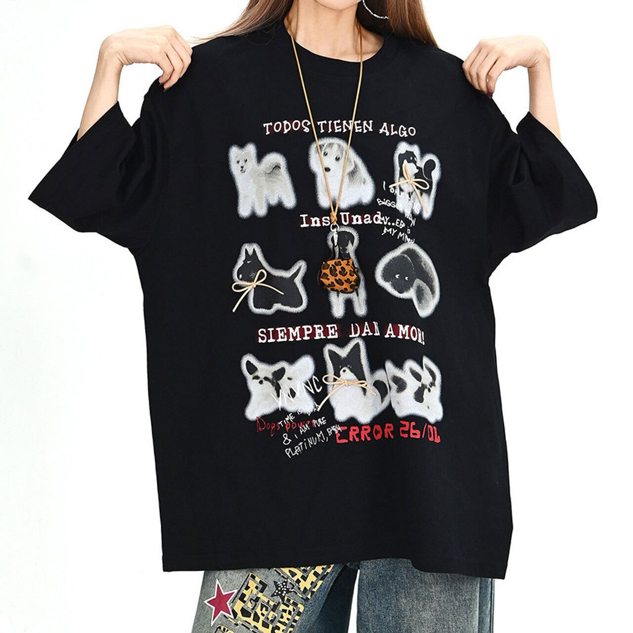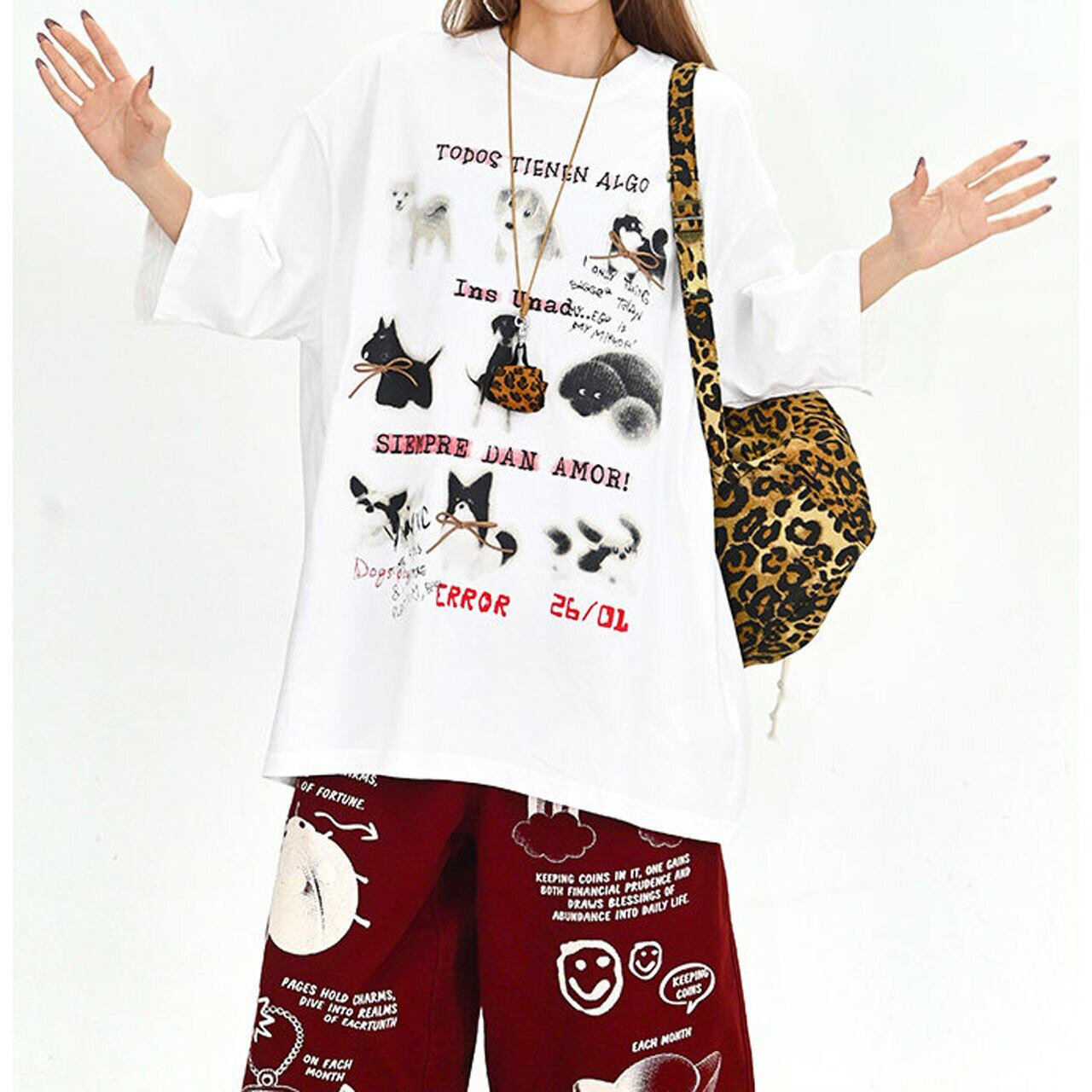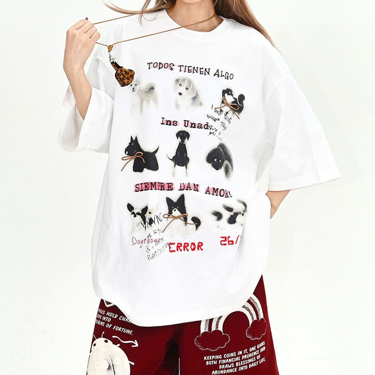 様々な犬のグラフィックが目を引く、存在感のあるTシャツ。