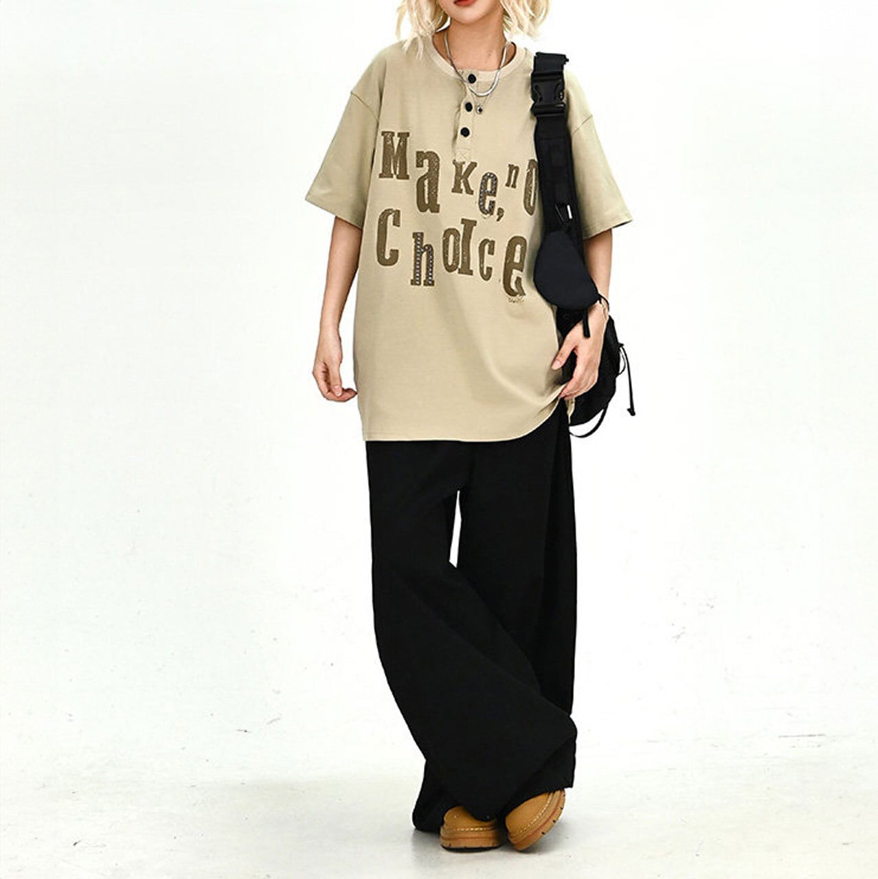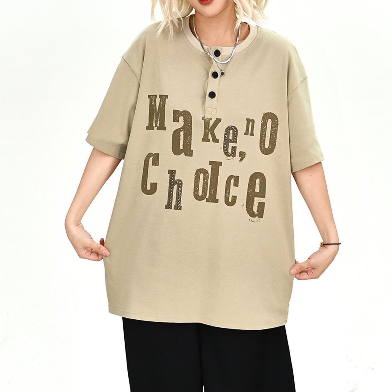 ヘンリーネックタイポグラフィルーズフォルムTシャツ 2col R02031