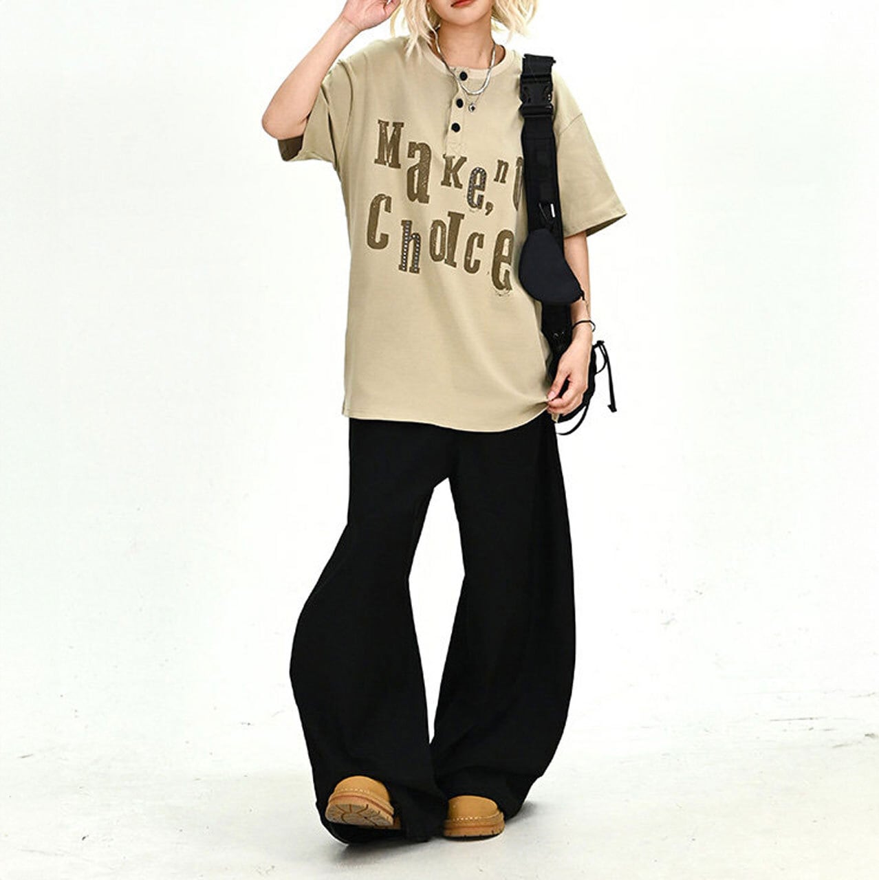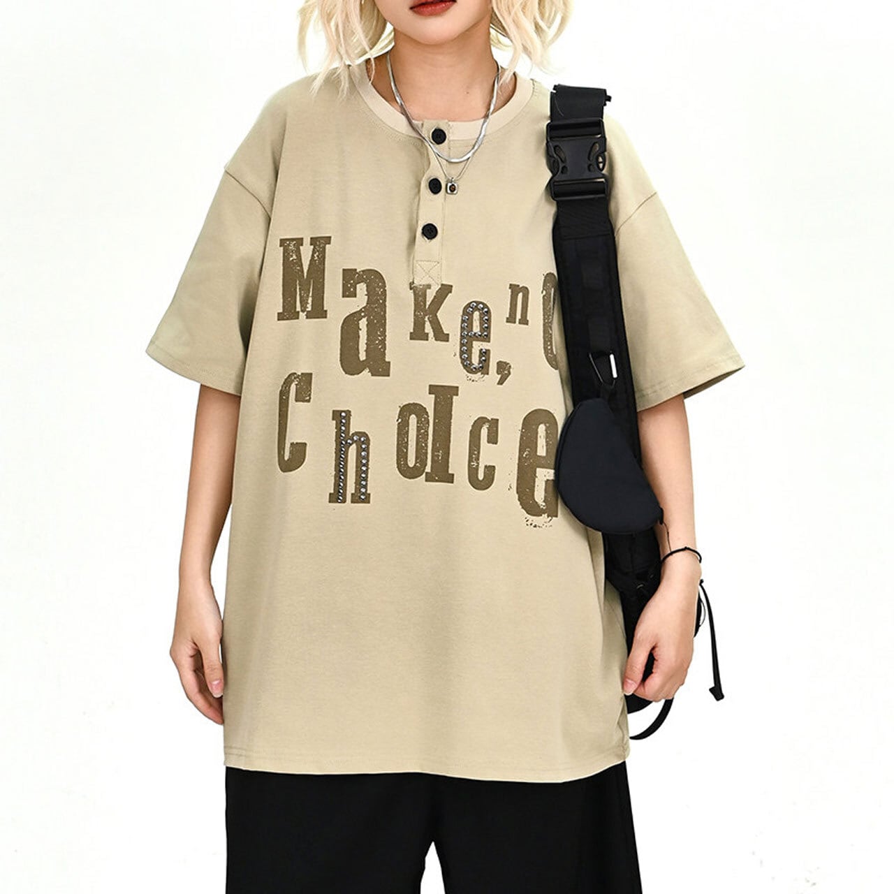 個性的なテキストデザインと首元のボタン使いが、いつものコーデに遊び心を加えます。
