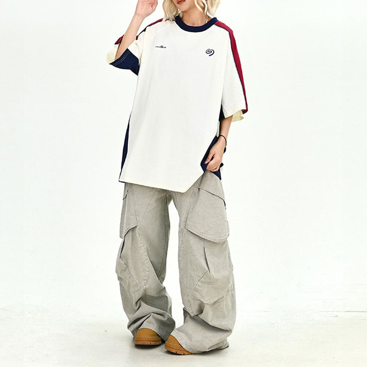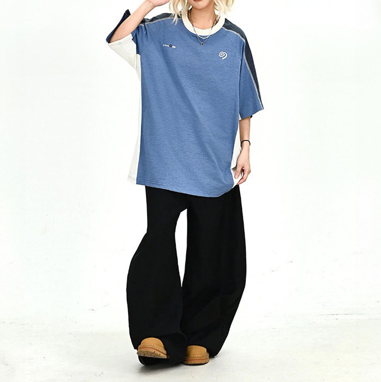 胸元のグラフィックモチーフが程よいアクセントとなり、ストリート感のある着こなしを完成させます。