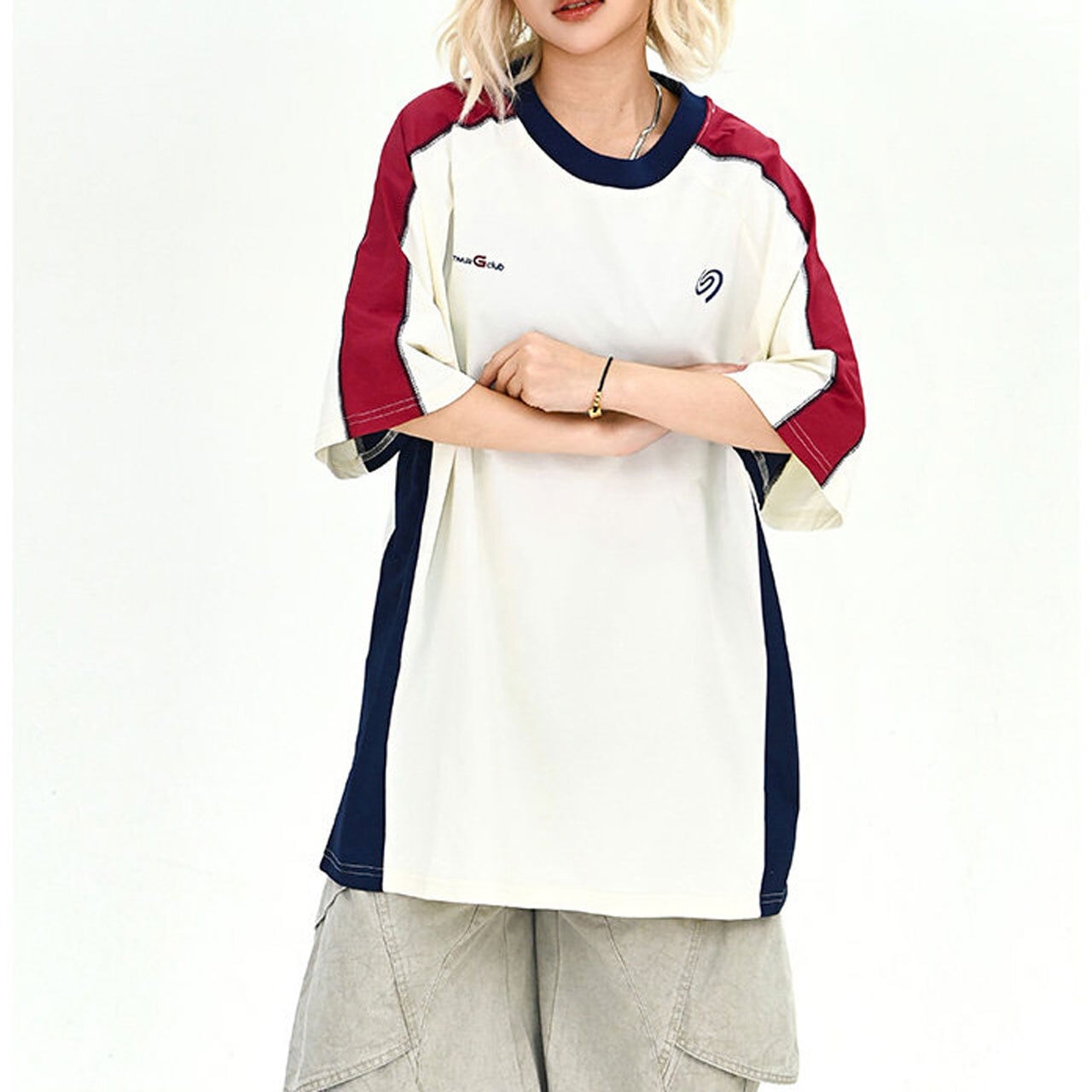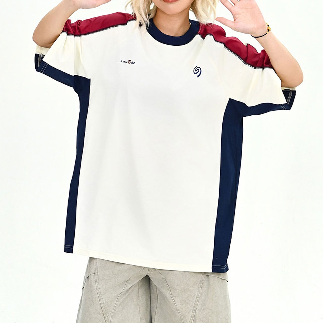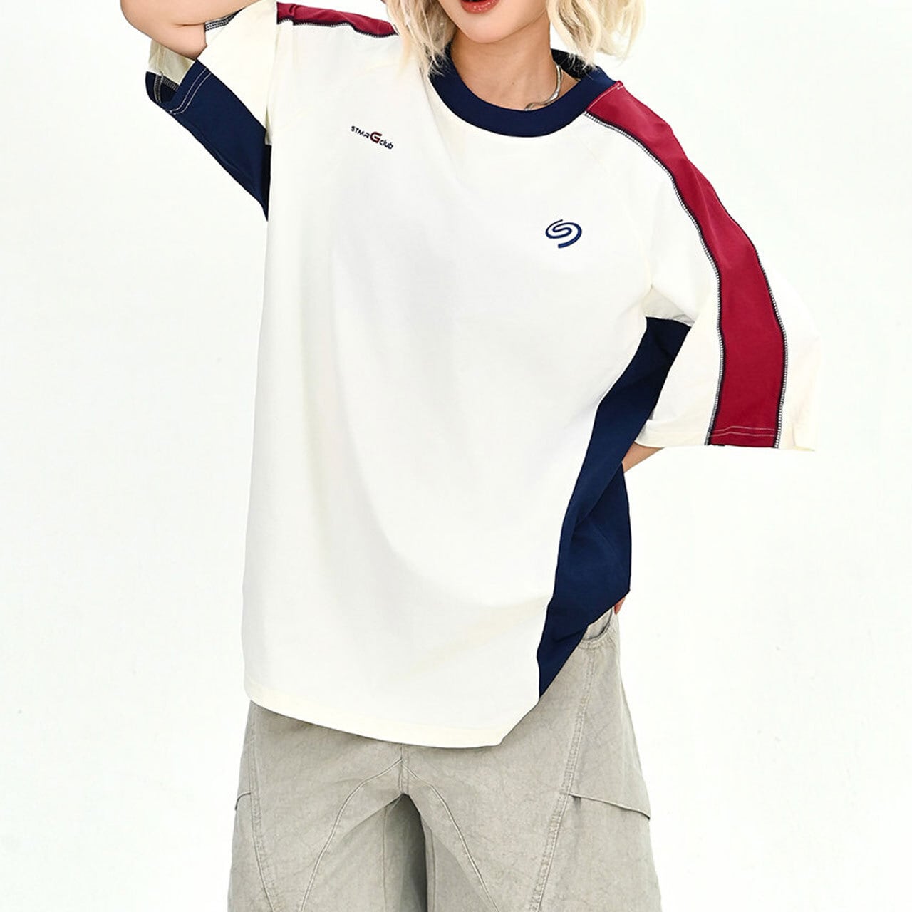 大胆なカラーブロックとラグランスリーブのデザインが目を惹く、スポーティーかつレトロな雰囲気のTシャツ。
