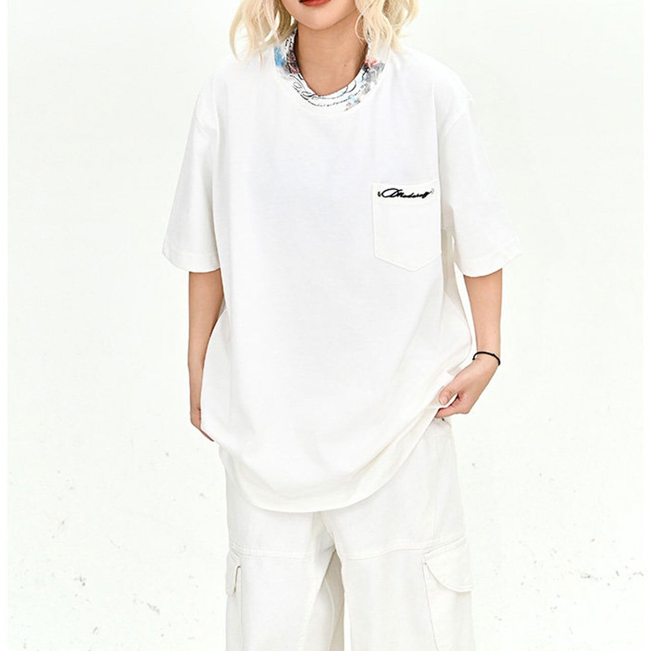 ルーズなカーゴパンツやワイドデニムと合わせた、ストリート感のある着こなしがおすすめです。