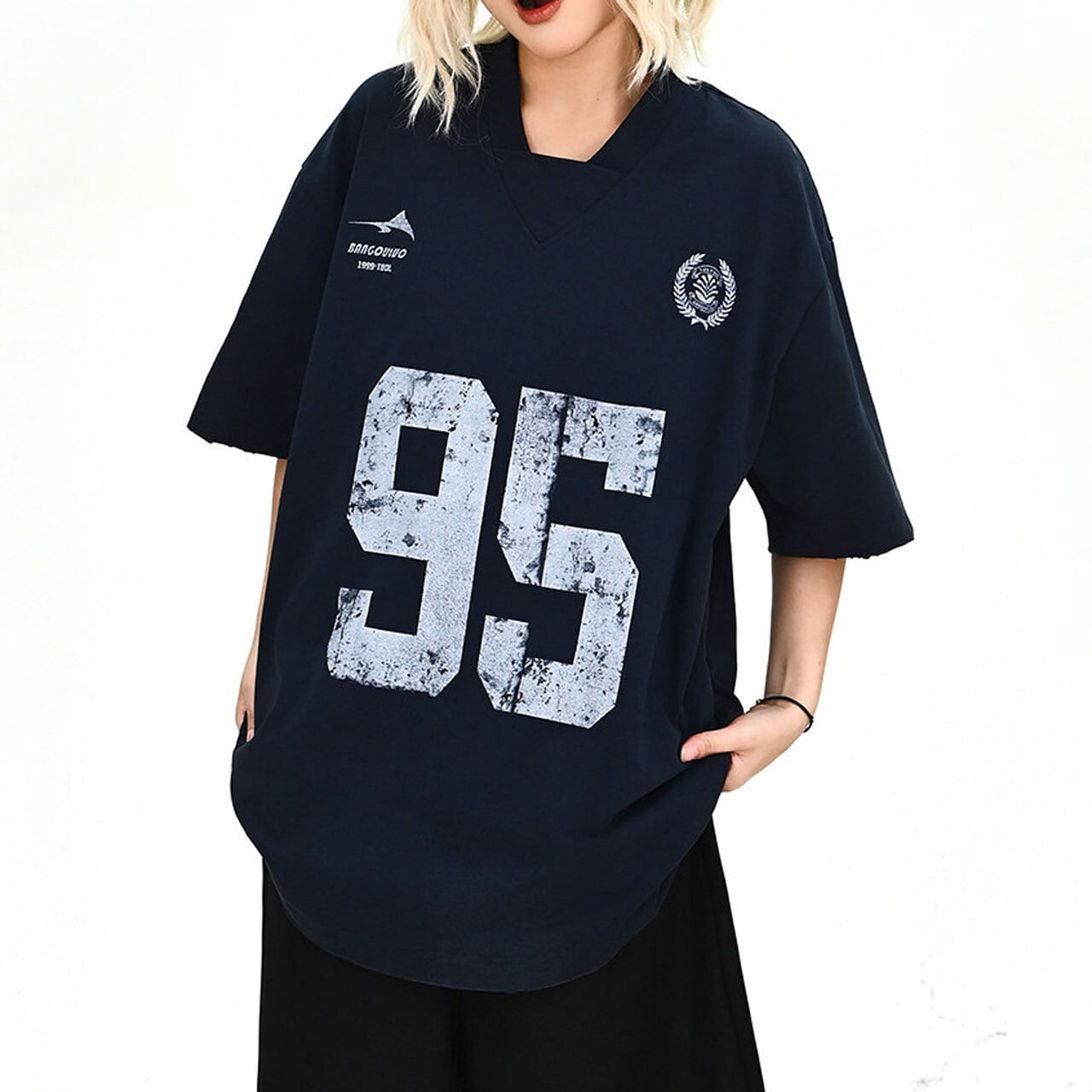首元のVディテールやロゴなど、細部までこだわったデザイン性が光る1枚です。
