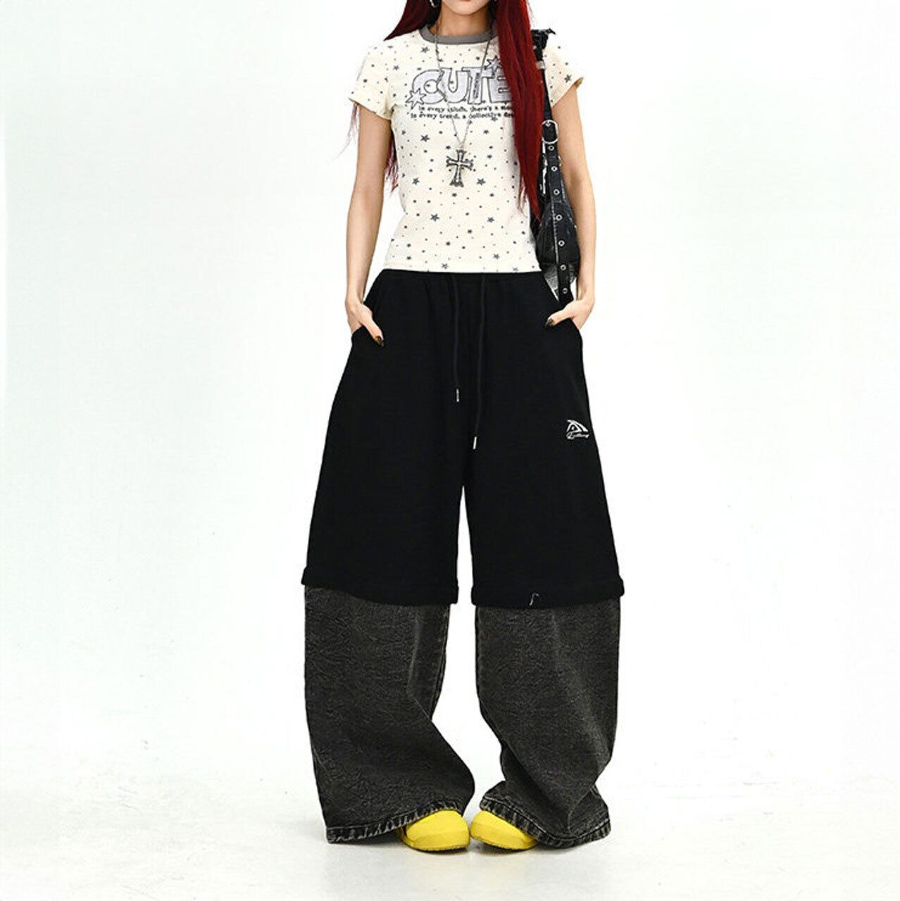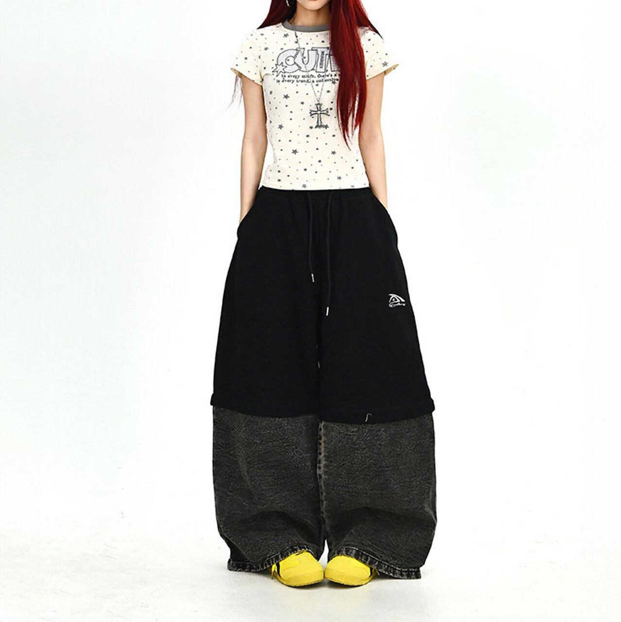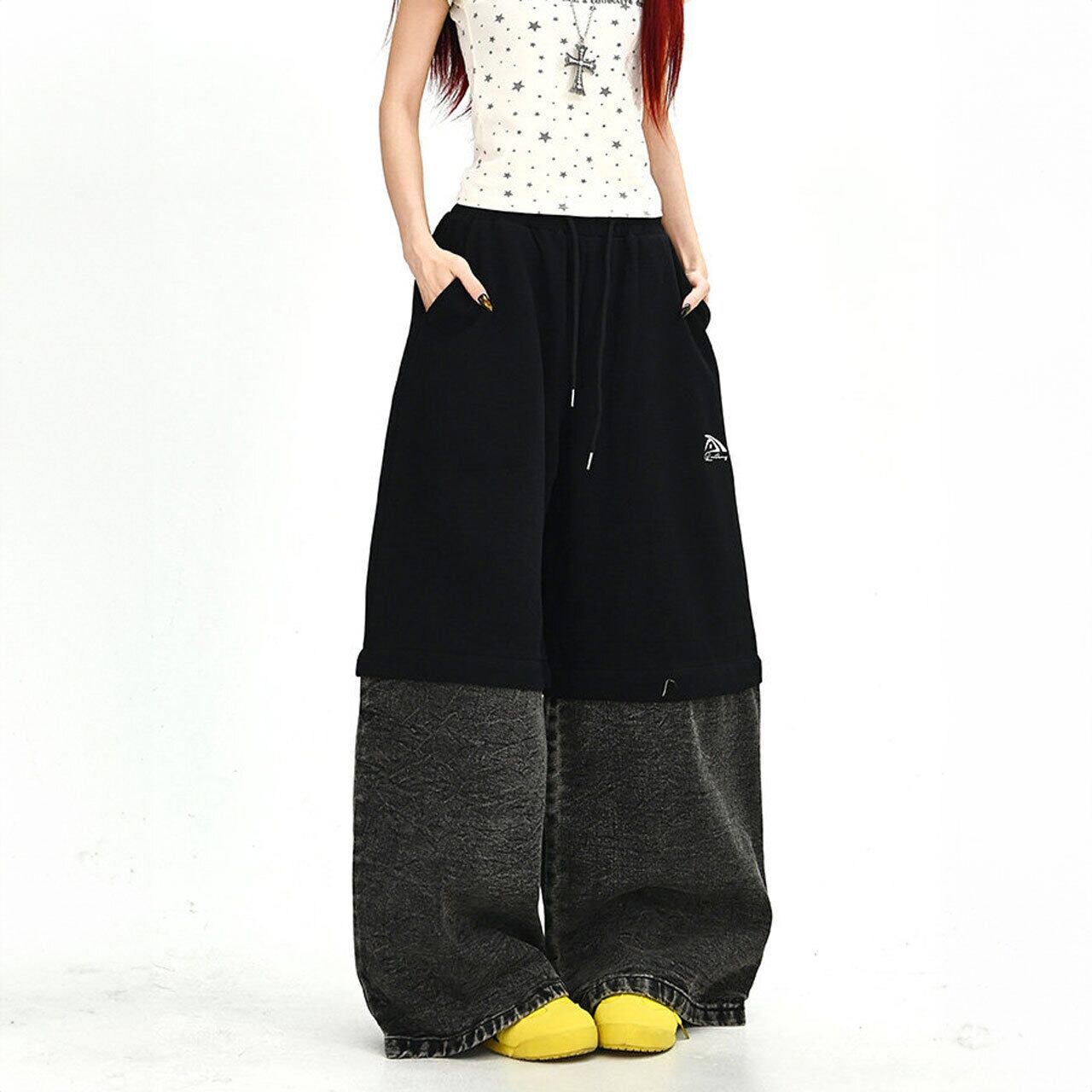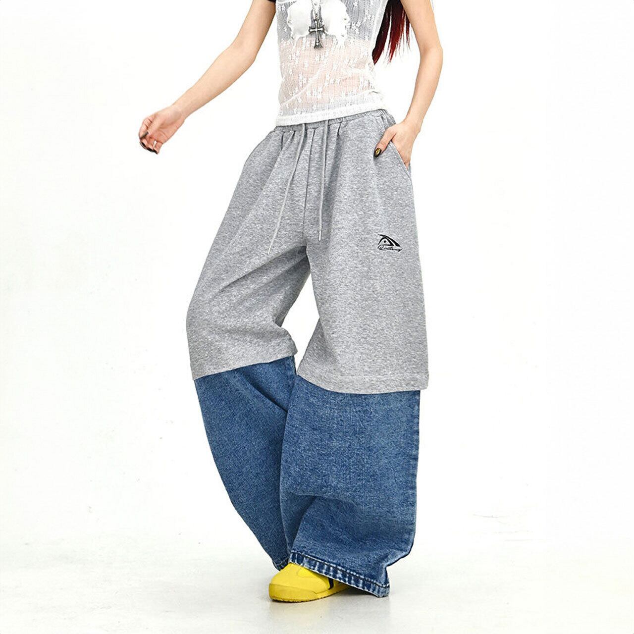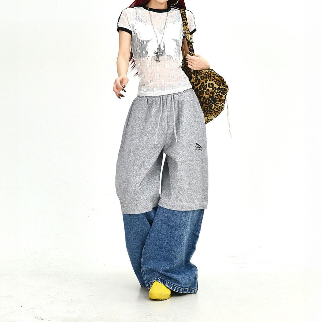 異なる表情の生地を組み合わせた大胆な切り替えデザインが目を惹くワイドボトム。