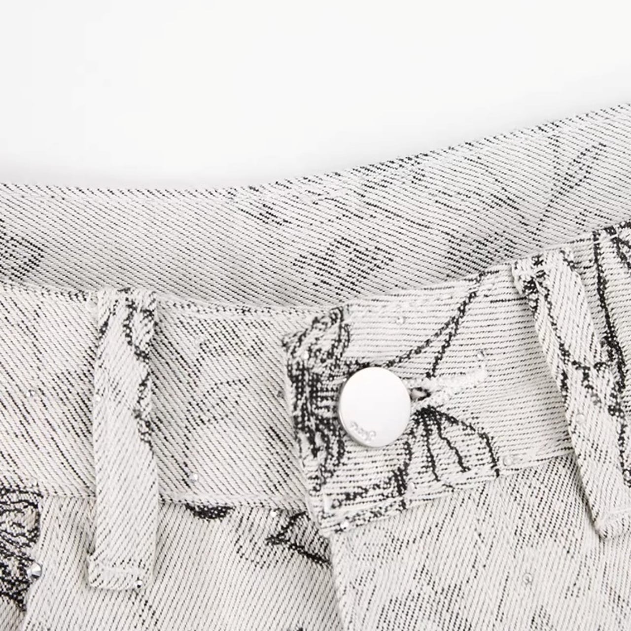 遊び心あふれるフラワーデザインが目を引く、個性的なデニムパンツ。