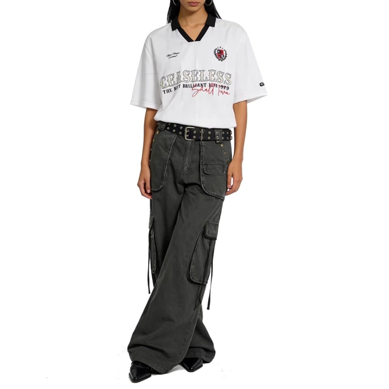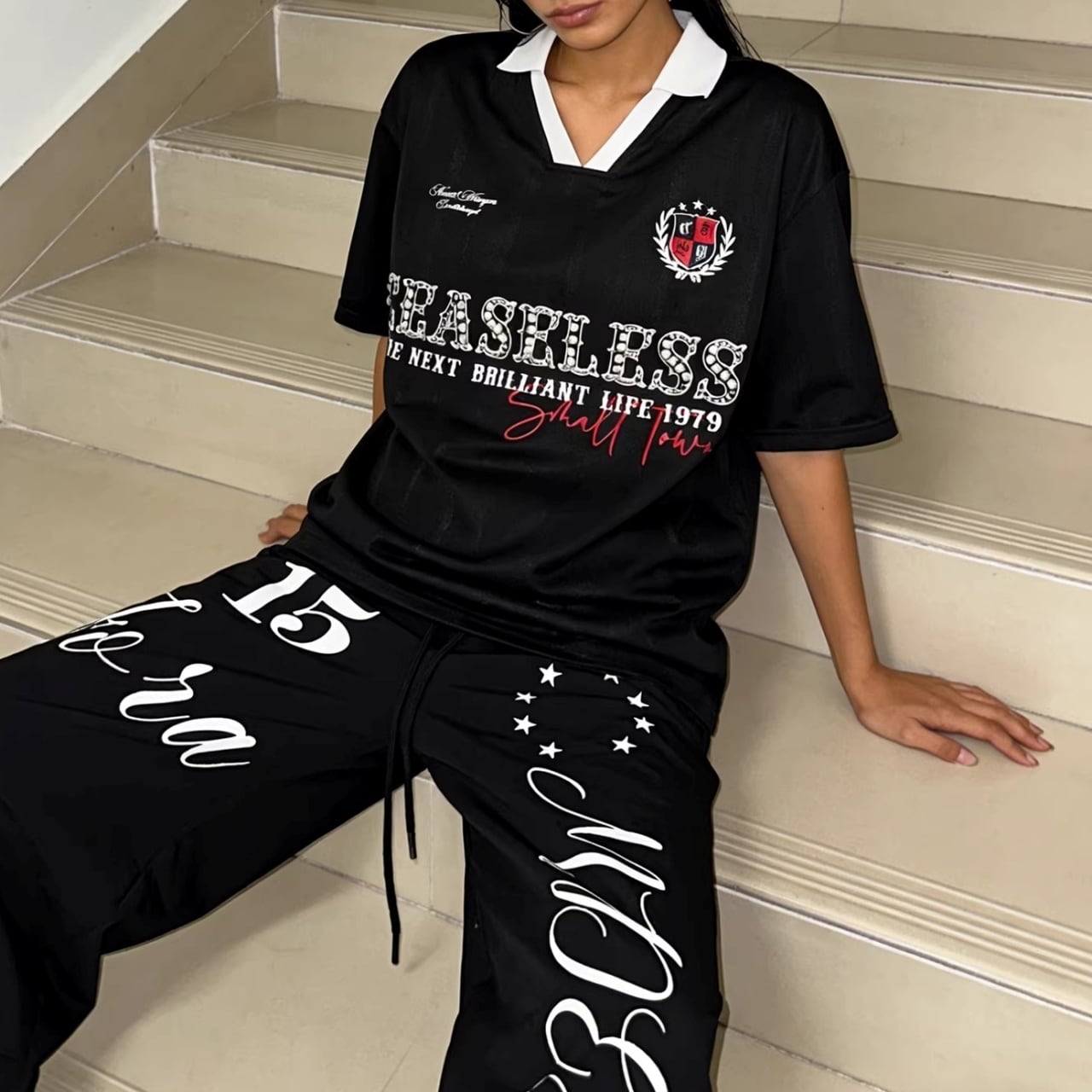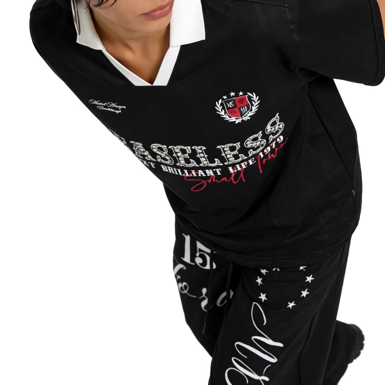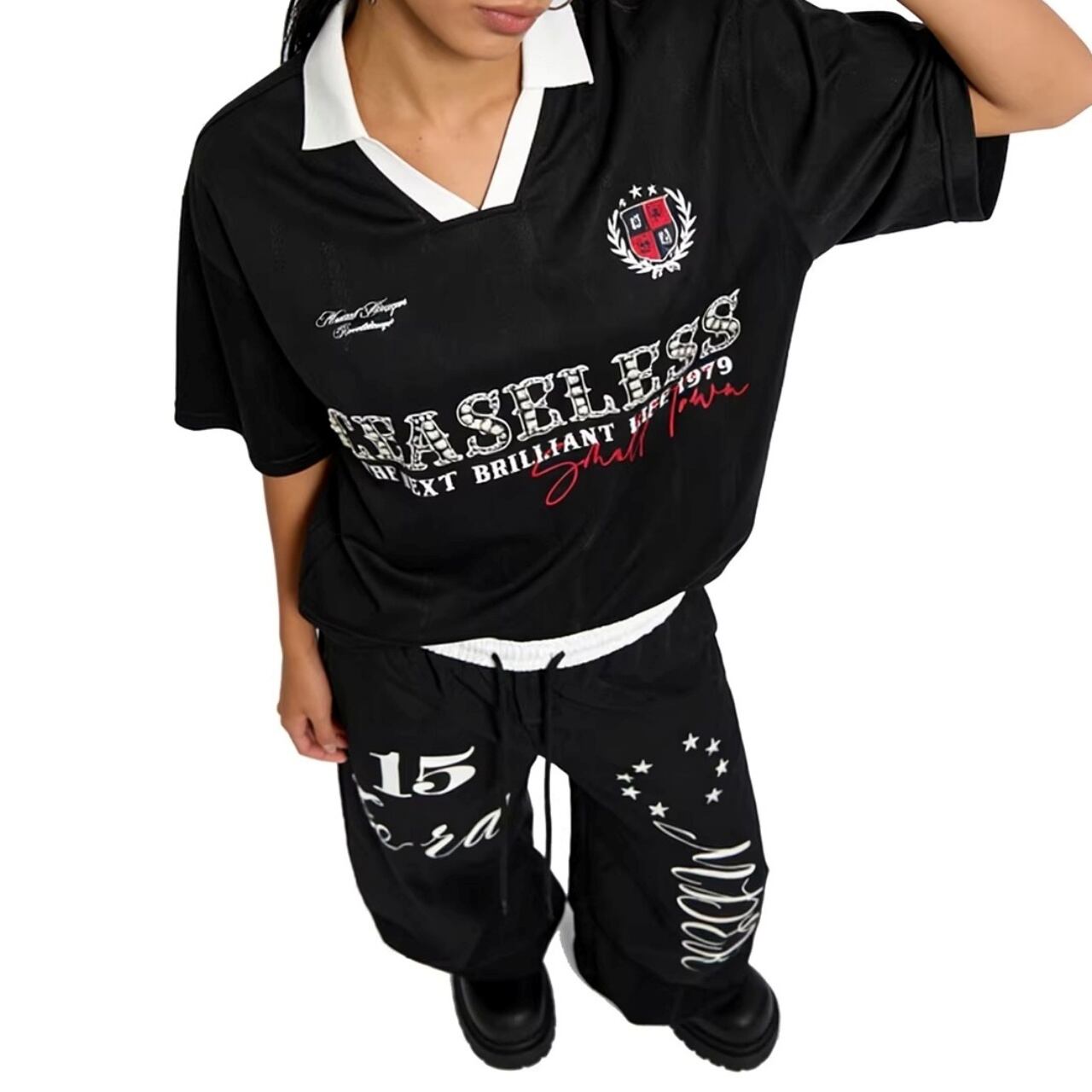 スポーティーなゲームシャツのディテールをベースに、レトロなエンブレムモチーフや大胆なレタリングを施した遊び心あふれる1枚。