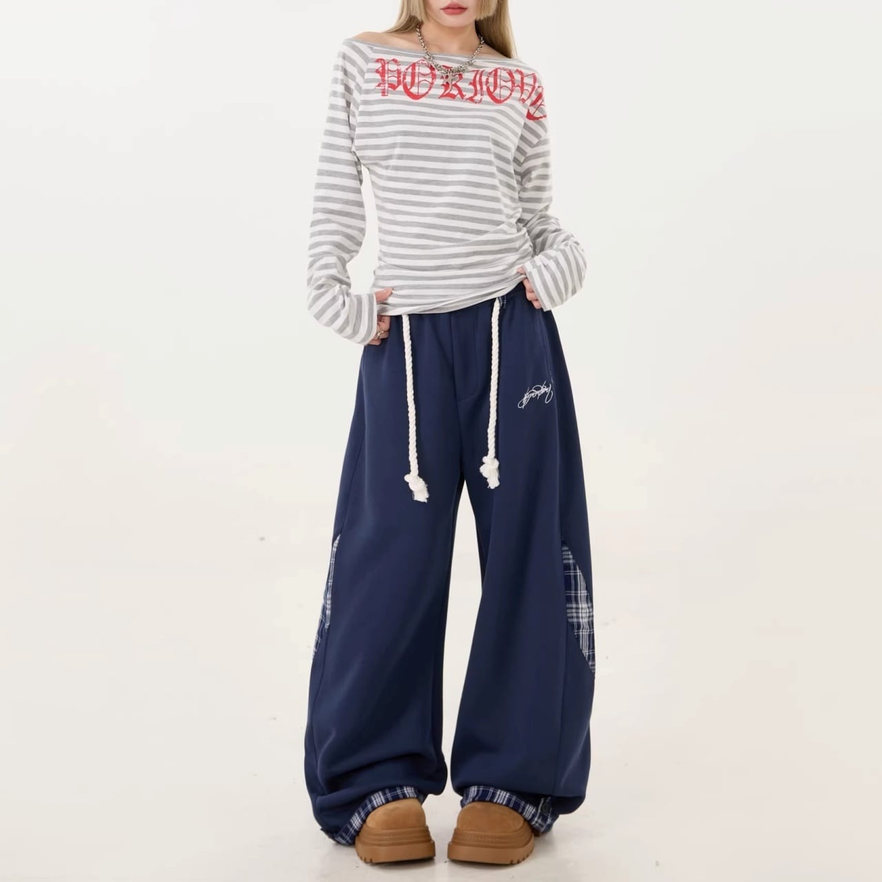 チェックパネルワイドラインスウェットパンツ 3col R02116