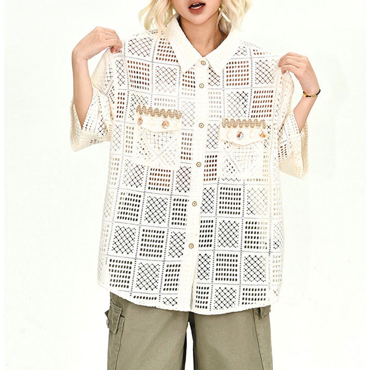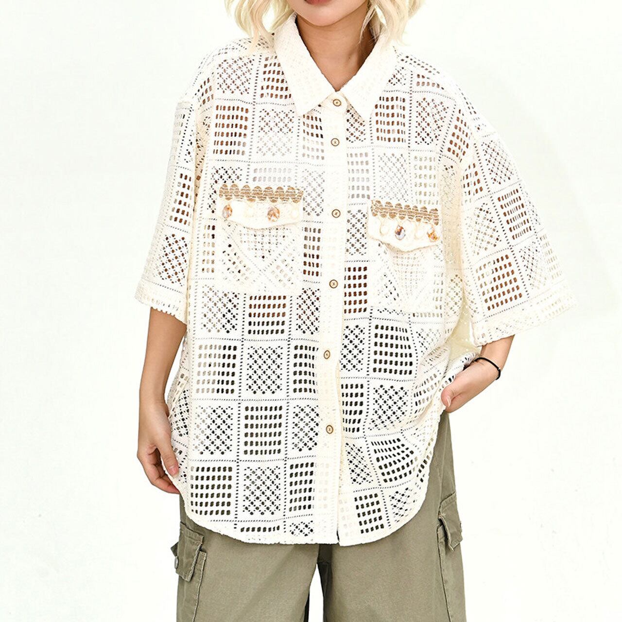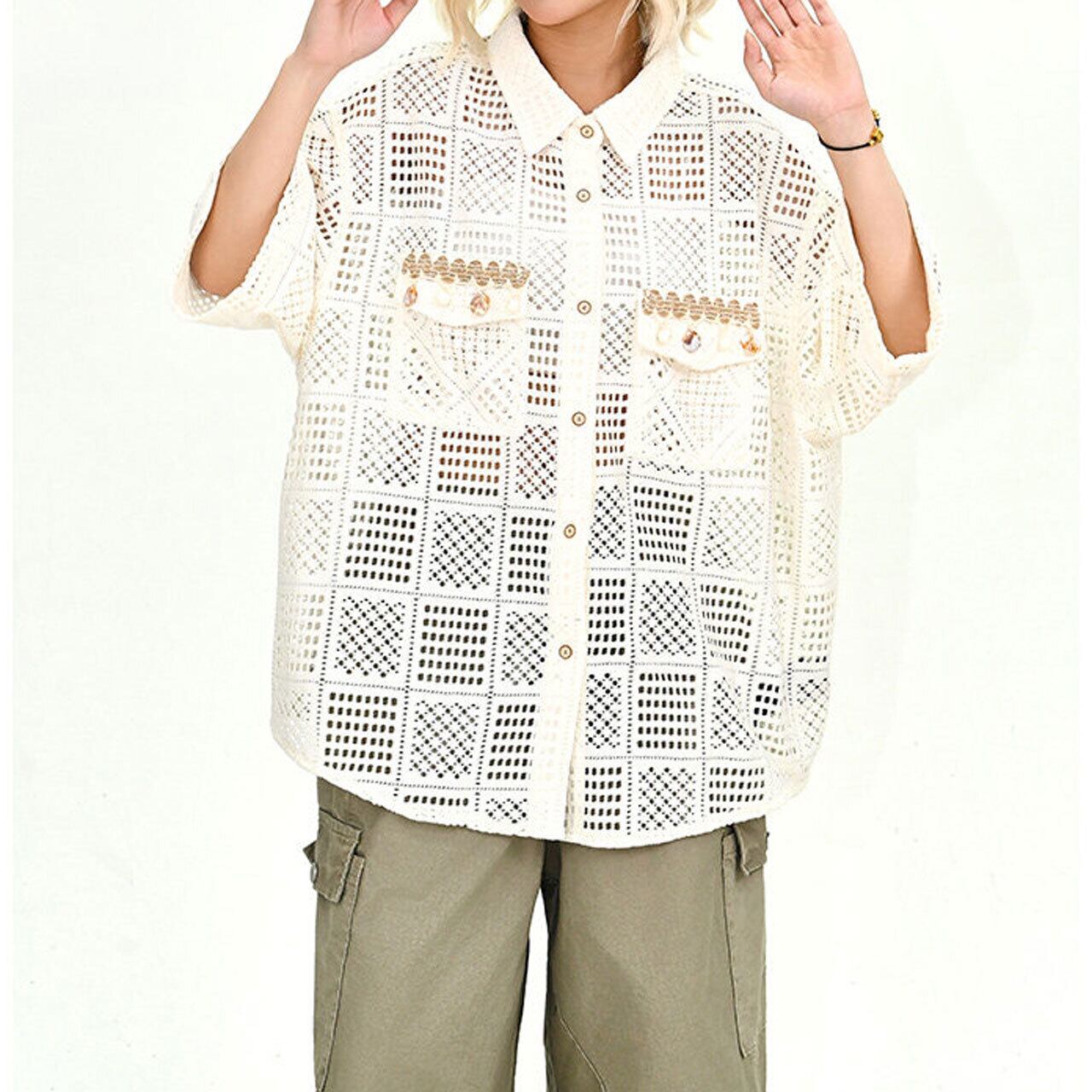 クロシェパッチワークワイドラインショートスリーブシャツ 1col R02181