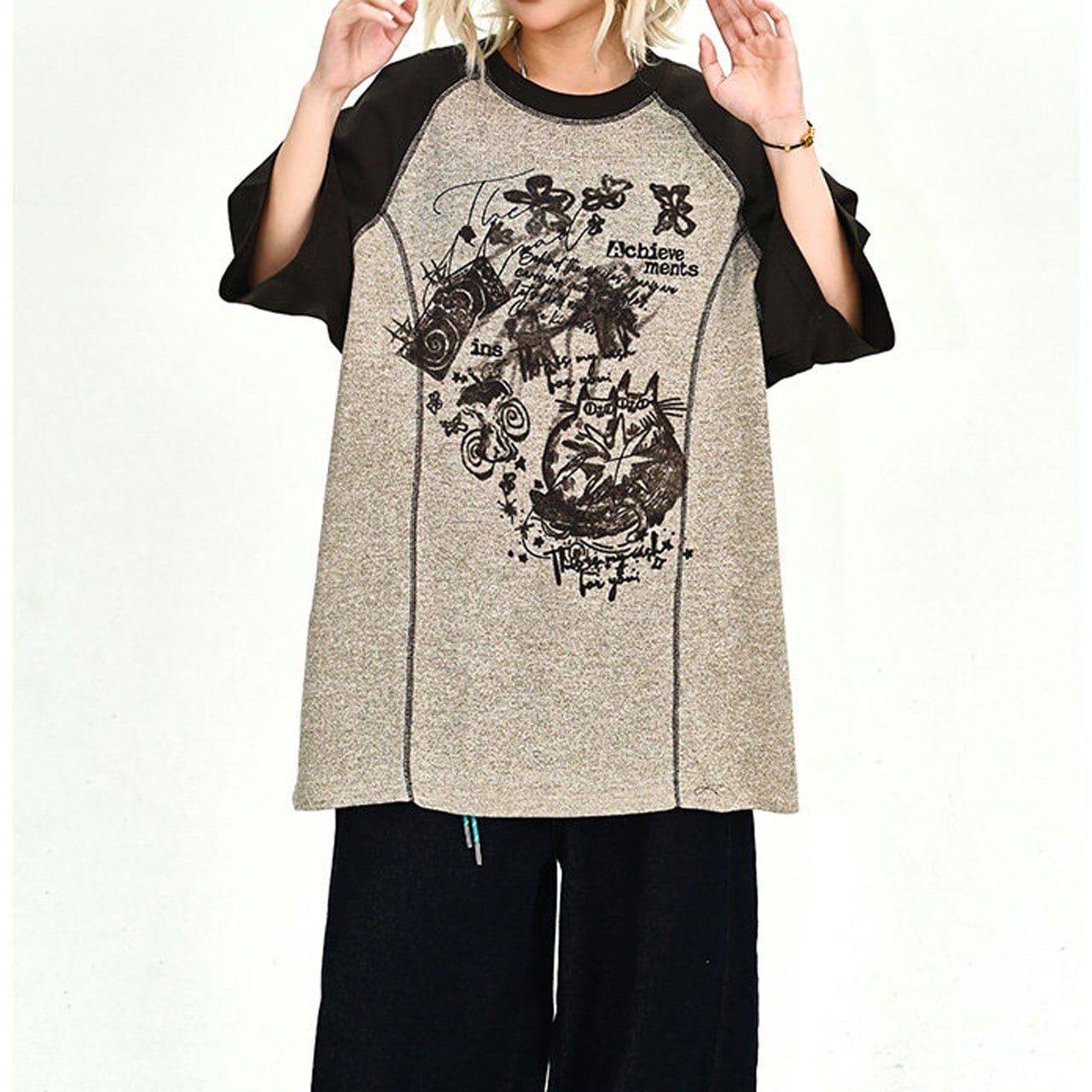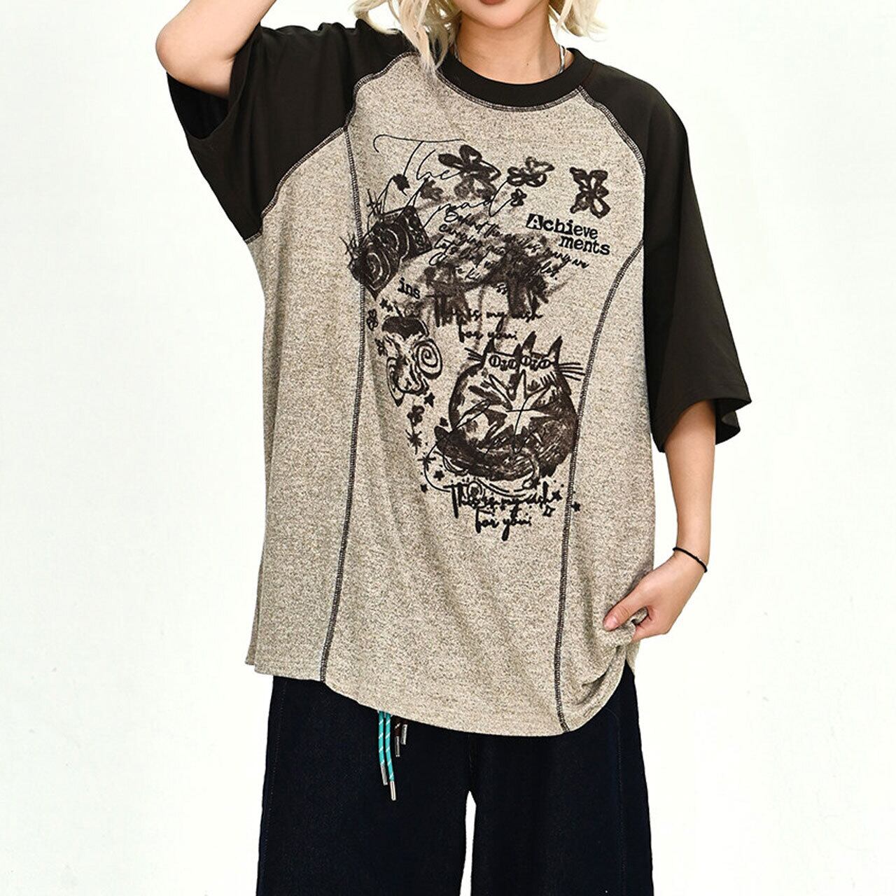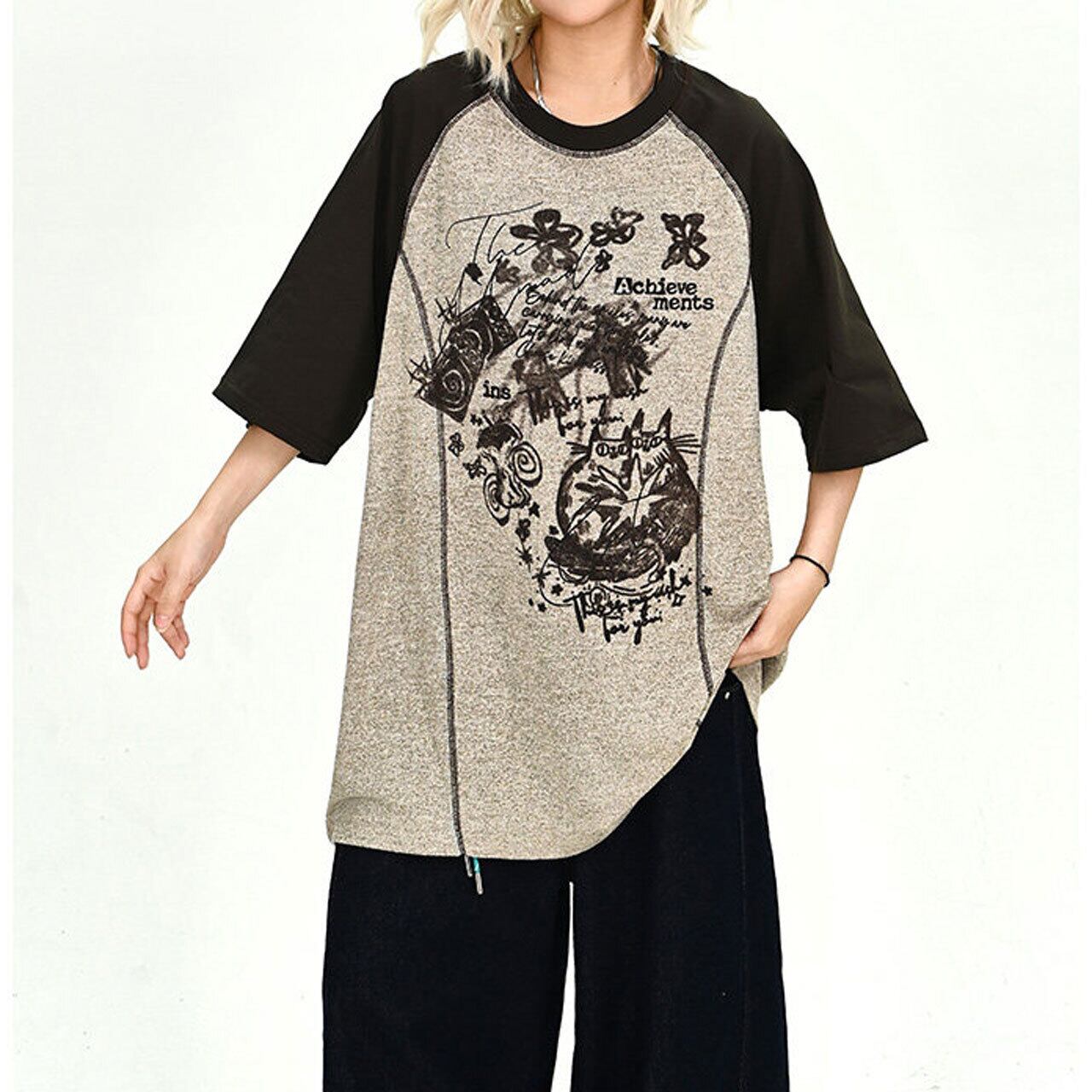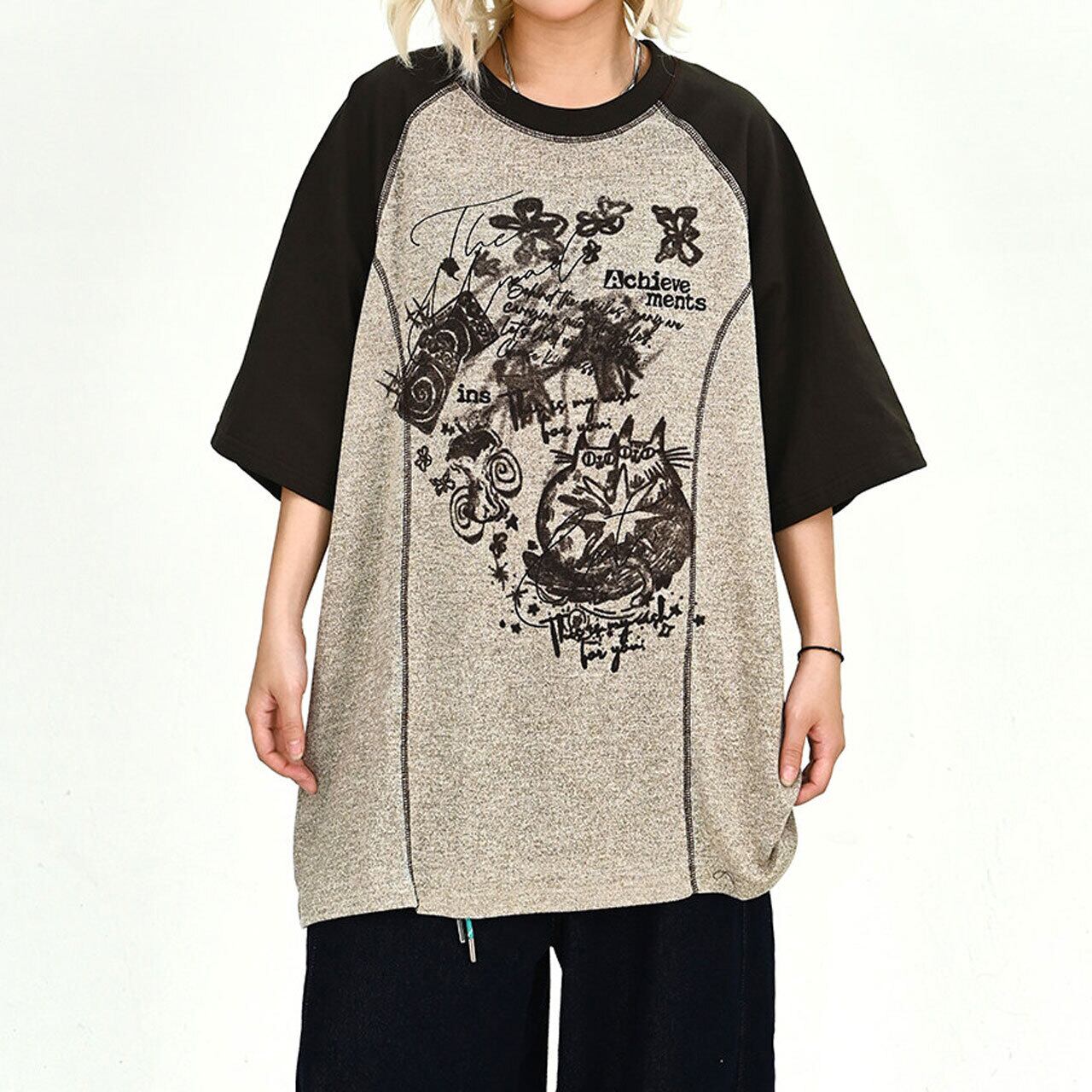 ハンドドローイングイラストルーズフォルムラグランTシャツ 1col R02186