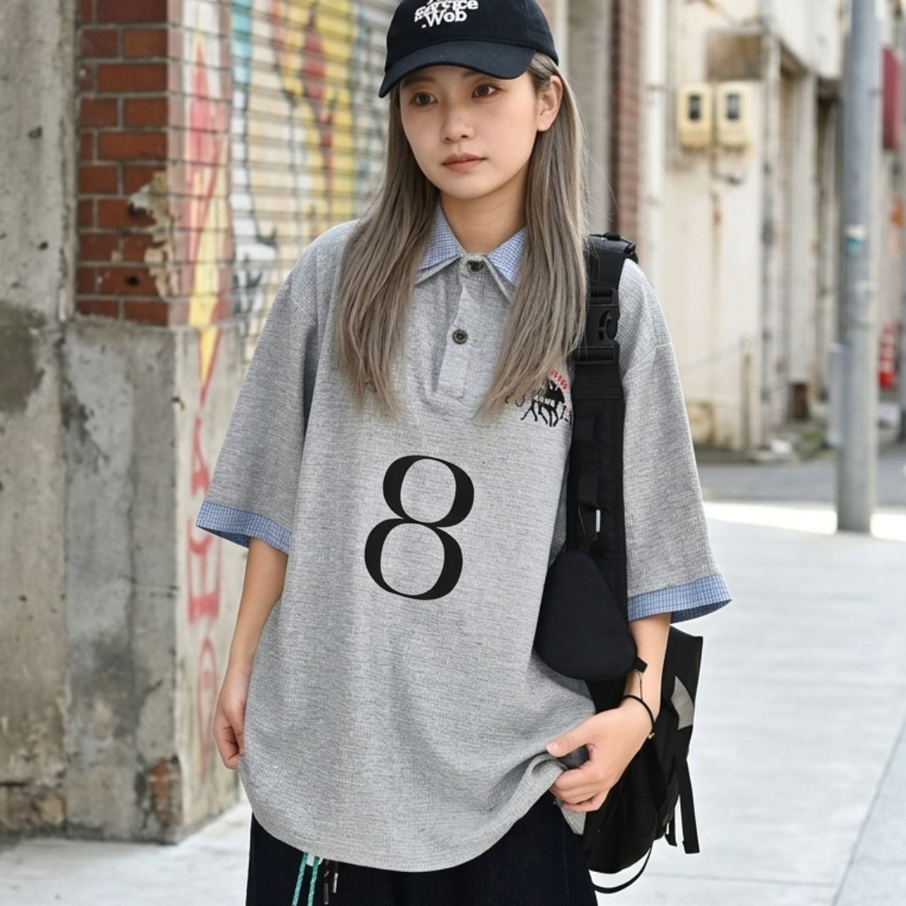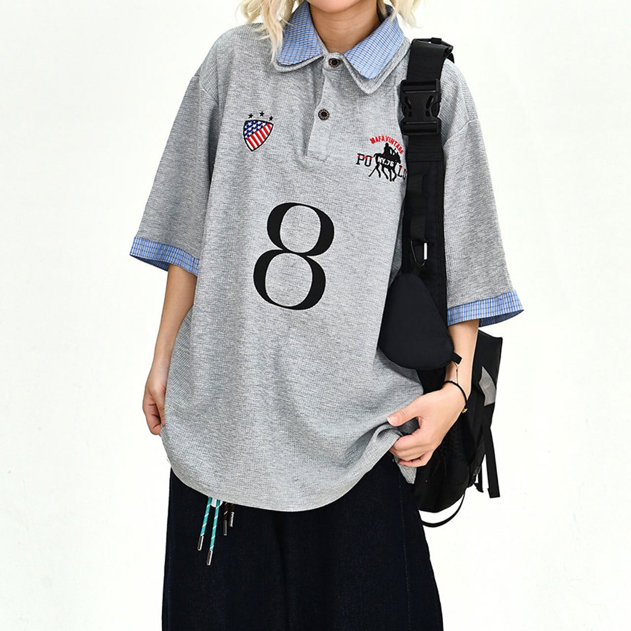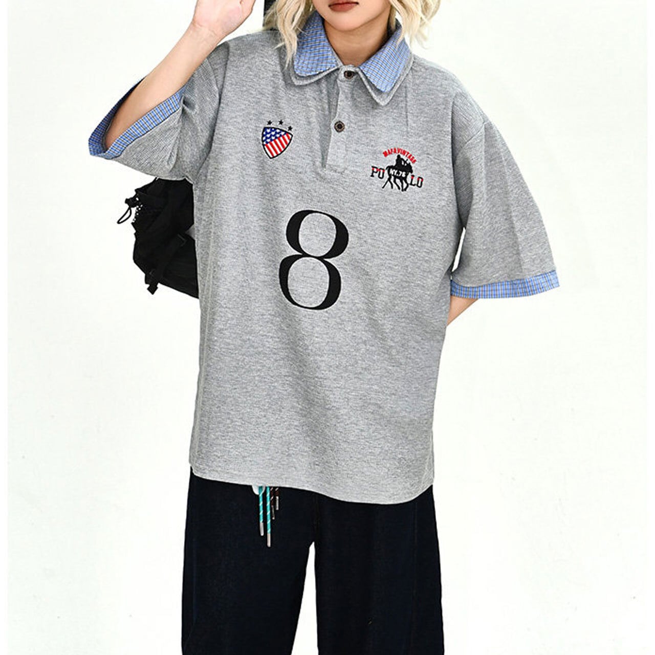 襟元や袖口のチェック切り替えが目を引く、ストリート感溢れるデザインポロ。