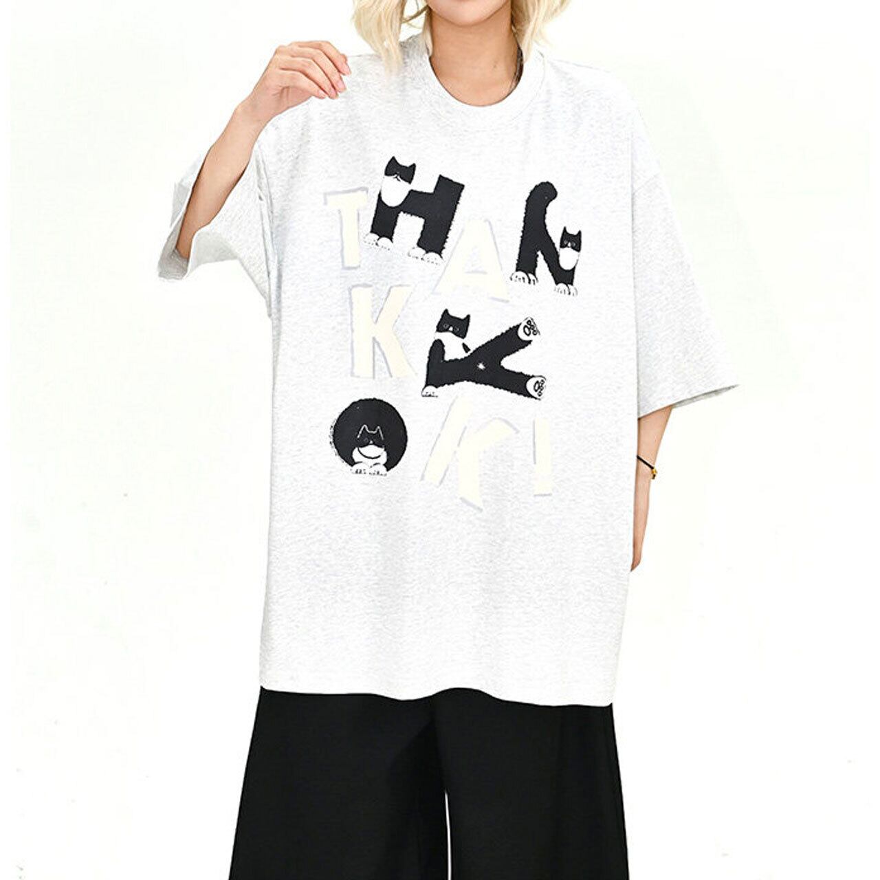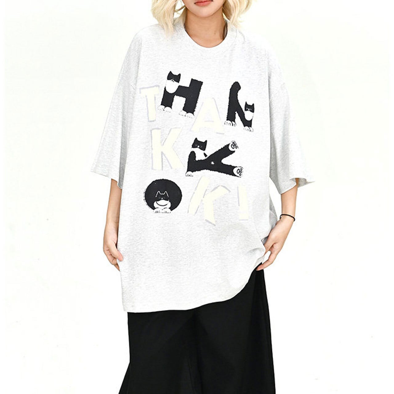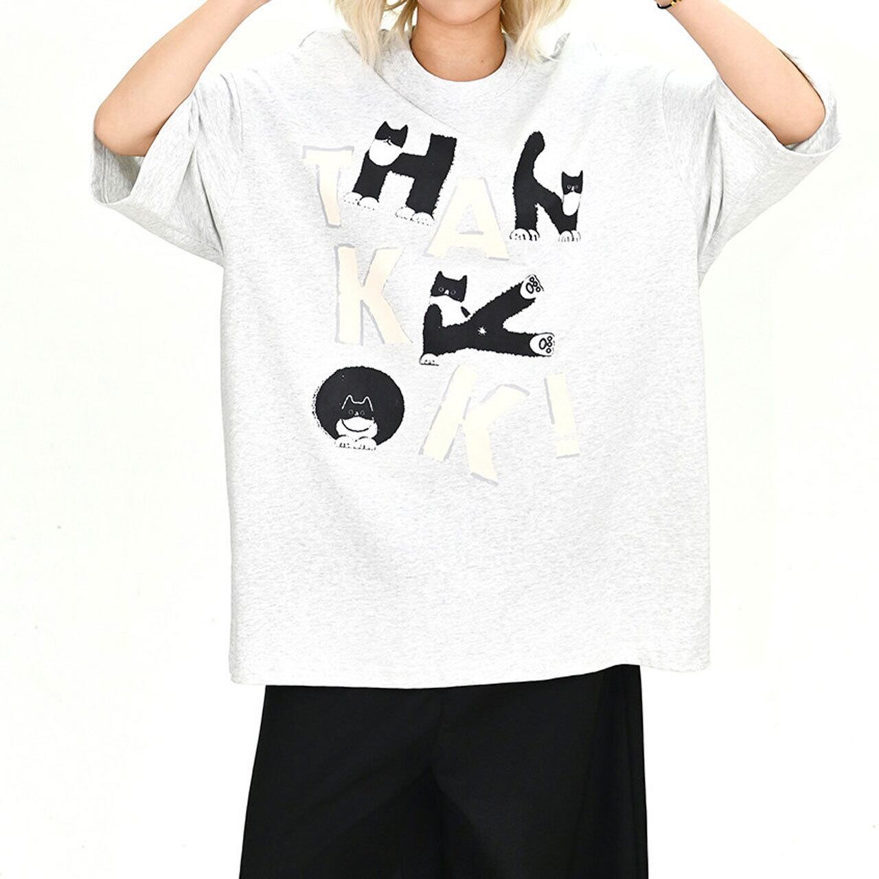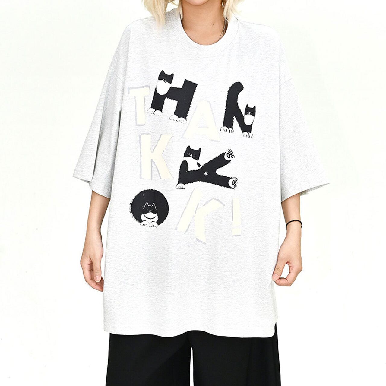 キャッチーなフォントと愛らしいキャットモチーフを大胆に配した、遊び心あふれるオーバーサイズTシャツ。