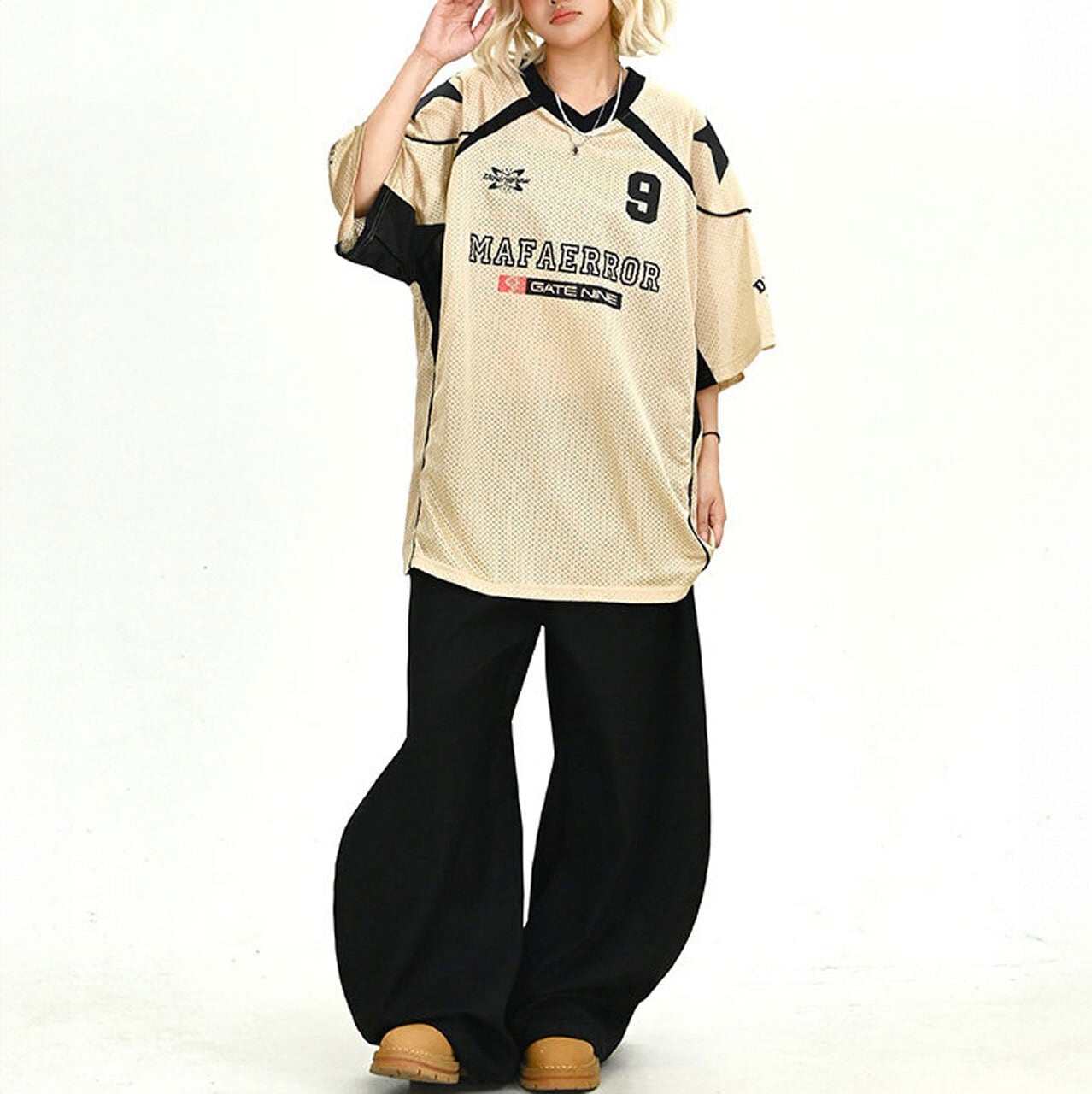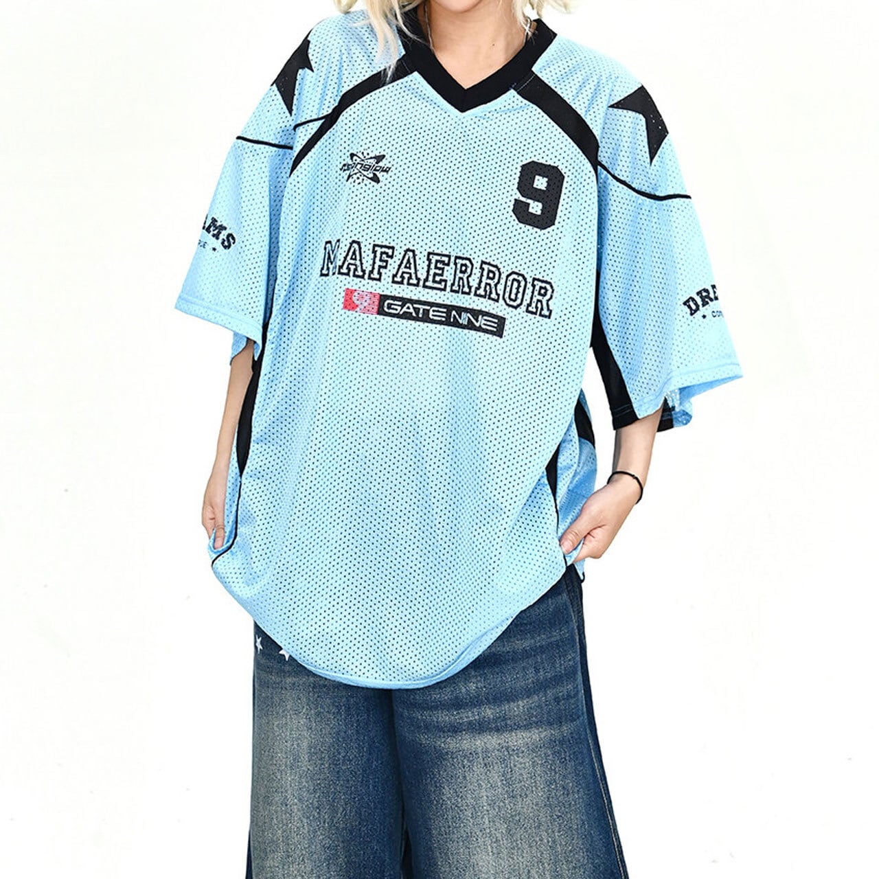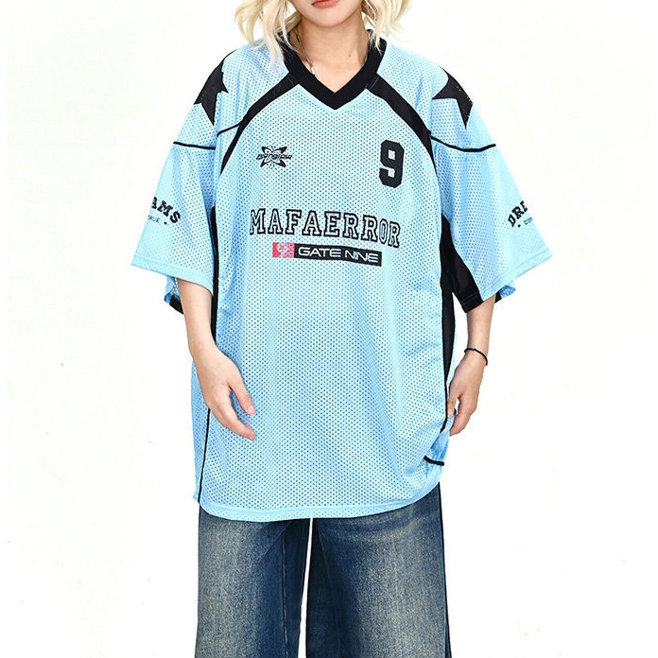 大胆なナンバリングとフロントロゴが目を惹く、ストリート感溢れるメッシュTシャツ。